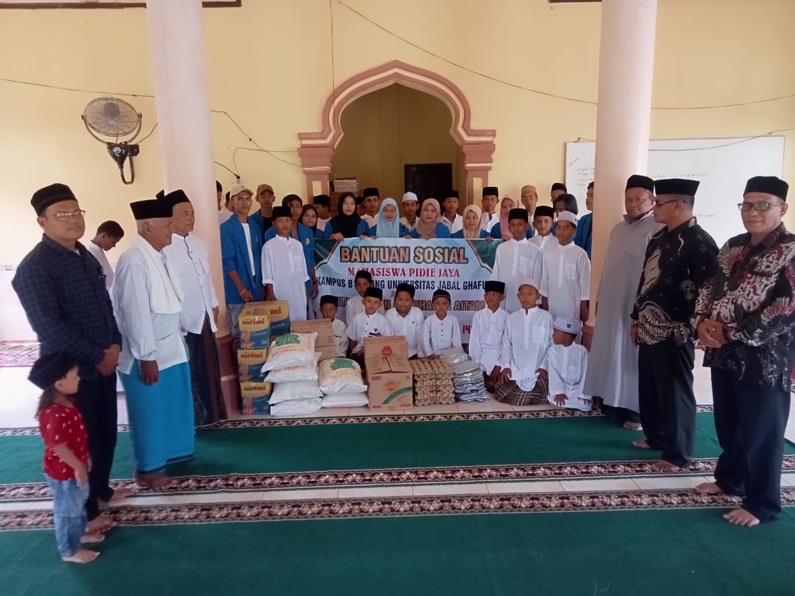 Mahasiswa dari Universitas Jabal Ghafur (UNIGHA) Sigli, Kampus B Meureudu salurkan bantuan sosial kepada Panti Asuhan Bustanul Aitam Ulim, Kabupaten Pidie Jaya, Jum'at (1/3/2024). Foto Harmadi