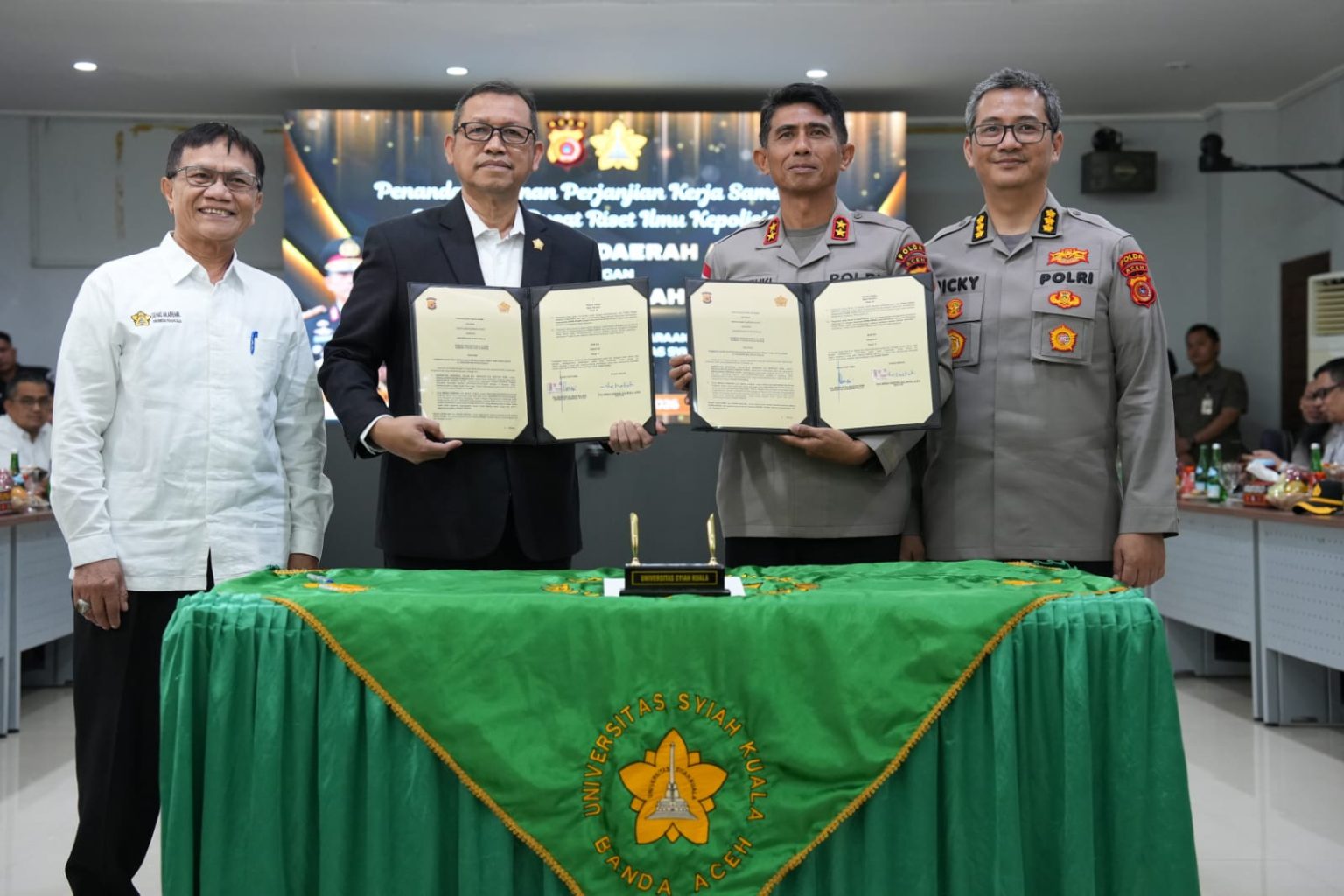 Penandatanganan dilakukan oleh Rektor USK, Prof. Mirza Tabrani, S.E., M.B.A., D.B.A., dan Kapolda Aceh, Irjen Pol. Drs. Marzuki Ali Basyah, M.M., disaksikan jajaran pimpinan Polda Aceh, senat universitas, serta sivitas akademika USK.