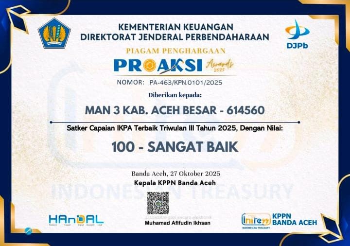 Kabarnanggroe.com, Aceh Besar — Madrasah Aliyah Negeri (MAN) 3 Aceh Besar mencatatkan prestasi gemilang di bidang tata kelola keuangan. Satuan kerja di bawah Kantor Kementerian Agama Kabupaten Aceh Besar ini berhasil meraih capaian Indikator Kinerja Pelaksanaan Anggaran (IKPA) Kategori Sangat Baik untuk Triwulan III dari Kantor Pelayanan Perbendaharaan Negara (KPPN) Banda Aceh.