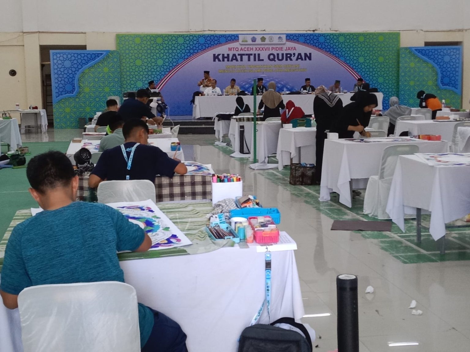 Kabarnanggroe.com, Meureudu – Musabaqah Tilawatil Qur’an (MTQ) XXXVII Tingkat Provinsi Aceh juga diperlombakan cabang khattil Qur’an atau cabang kaligrafi. Cabang Khattil Qur’an merupakan perlombaan seni menulis ayat-ayat suci Al-Qur’an dengan indah dan rapi. Pada lomba khattil qura’an ada empat katagori utama, yaitu Naskah, Hiasan Mushaf, Dekorasi, Kontemporer, sementara itu katogori Khattil digital merupakan exisibisi.