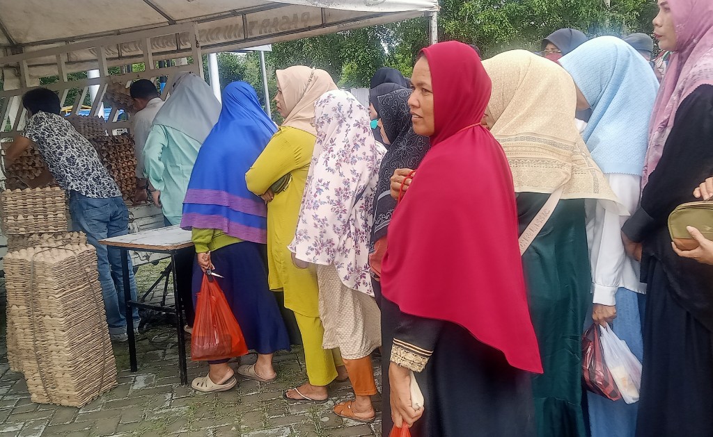 Karena banyaknya IRT yang berminat membeli telur ayam ras, sehingga harus rela antri.