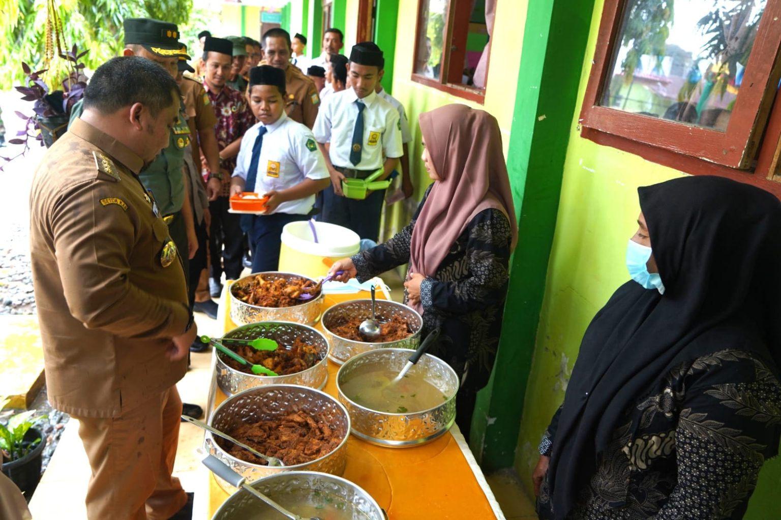 Pj Bupati Aceh Besar Muhammad Iswanto SSTP MM didampingi Kasdim 0101/KBA, Camat Darul Imarah dan Kepala Sekolah SMP Negeri 1 Darul Imarah melihat simulasi makan siang gratis bergizi untuk pelajar di SMPN 1 Darul Imarah, Aceh Besar, Selasa (5/3/2024). FOTO/ BEDU SAINI