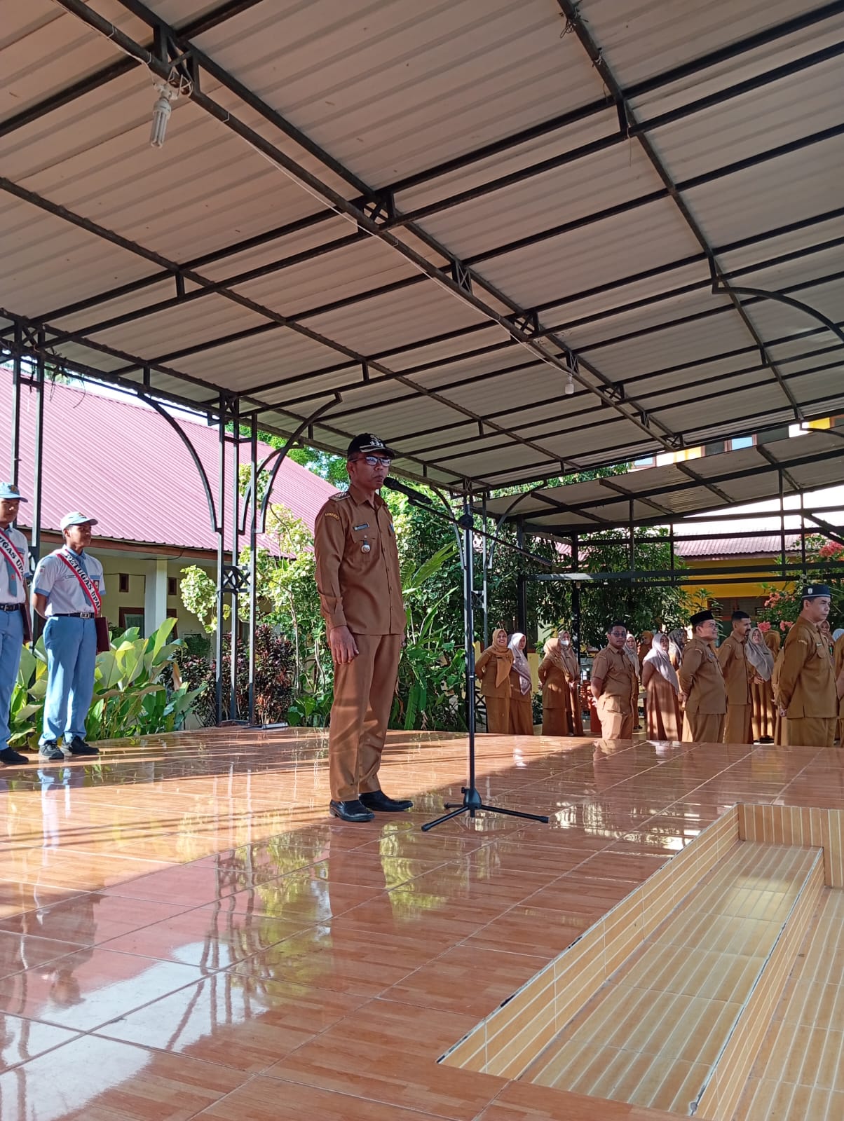 Camat Peukan Bada, Salamuddin ZM SE, menyampaikan pesannya, saat bertindak sebagai pembina upacara rutin di SMAN 1 Peukan Bada, Kabupaten Aceh Besar, Senin (6/4/2026). FOTO/ WAHYU DESMI
