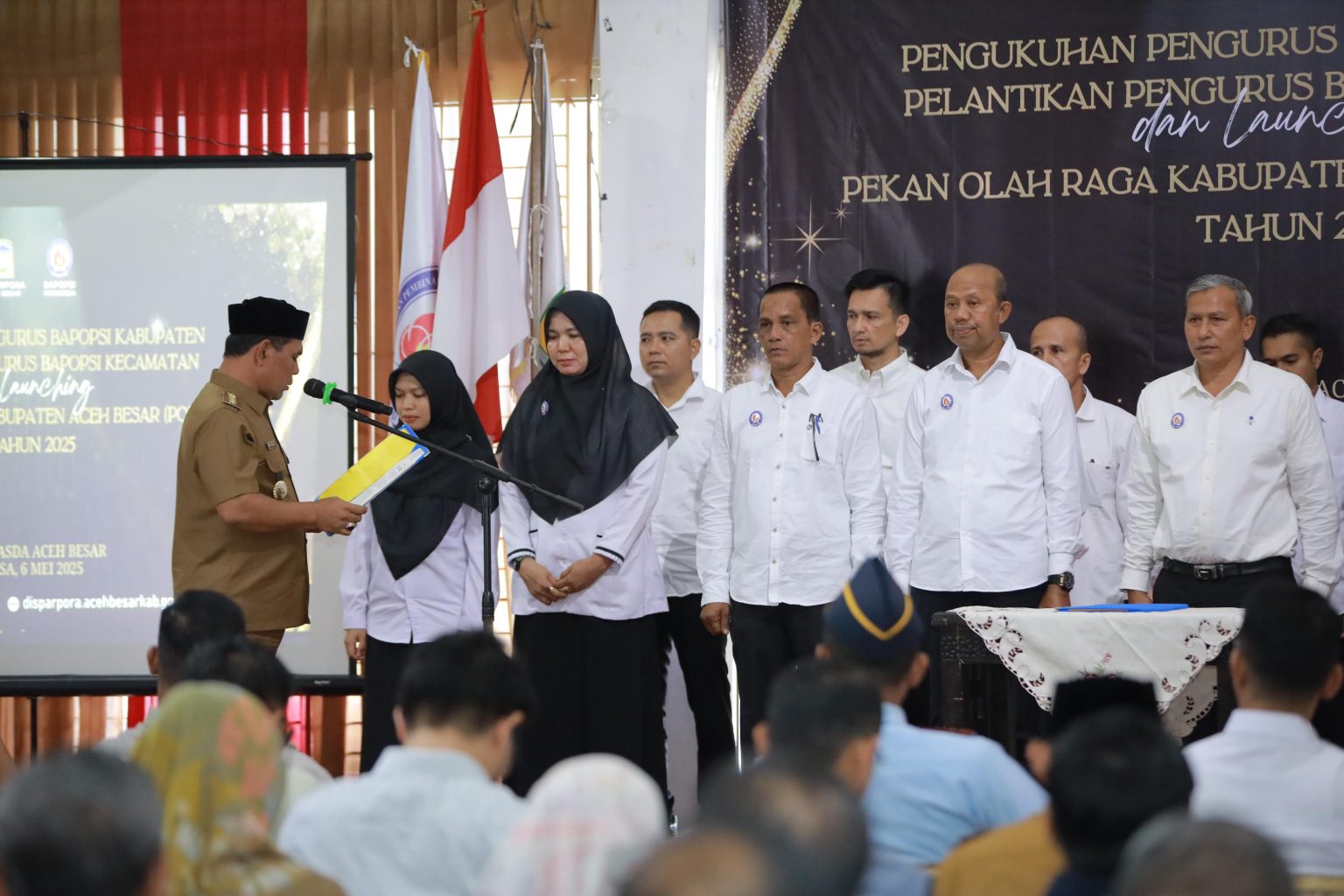Bupati Aceh Besar H. Muharram Idris (Syech Muharram) mengukuhkan dan melantik pengurus BAPOPSI tingkat Kabupaten dan pengurus BAPOPSI Kecamatan serta melaunching PORKAB Tahun 2025, di Gedung Dekranasda Gampong Gani, Kecamatan Ingin Jaya, Aceh Besar, Selasa (06/05/2025). FOTO/ BEDU SAINI