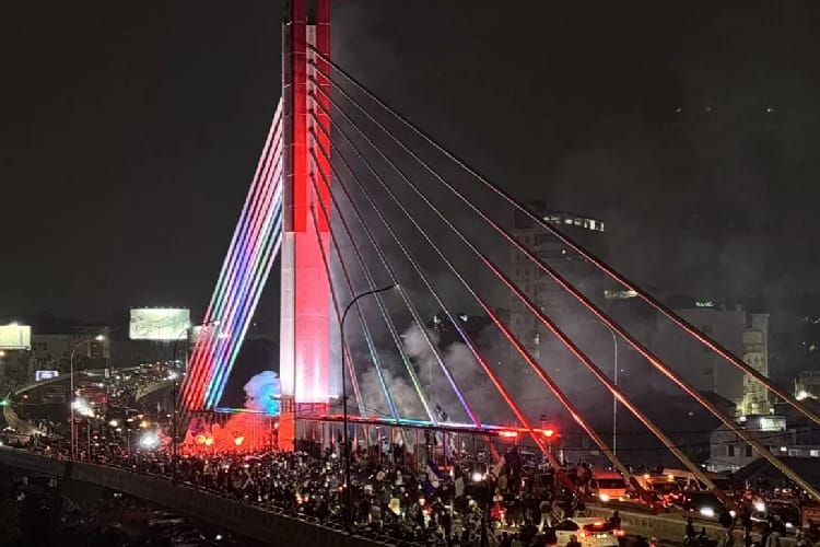 Ribuan suporter setia Persib Bandung yang dikenal sebagai Bobotoh membanjiri Flyover Pasupati, Bandung, pada Senin (6/5/2025) malam untuk merayakan gelar juara Liga 1 2024/2025.