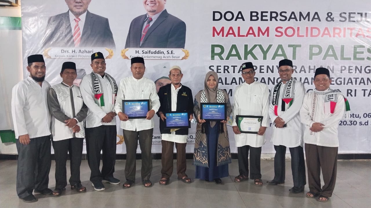 Acara yang di kemas dengan Doa bersama-sejuta puisi dan solidaritas untuk rakyat Palestina di liput dan di publikasikan oleh berbagai media lokal dan nasional. Pada malam yang penuh kenangan ini tercatat 140 orang ASN dan siswa madrasah mendapatkan piagam penghargaan yang di serahkan oleh Kepala Kantor Kementerian Agama Kabupaten Aceh Besar H Saifuddin SE di dampingi Kasubbag tata usaha H Khalid Wardana SAg MSi dan para kepala seksi yaitu H Akhyar MAg,H Nazaruddin SE, Jamaluddin SE, Suryadi SAg dan Az Zahri MH.