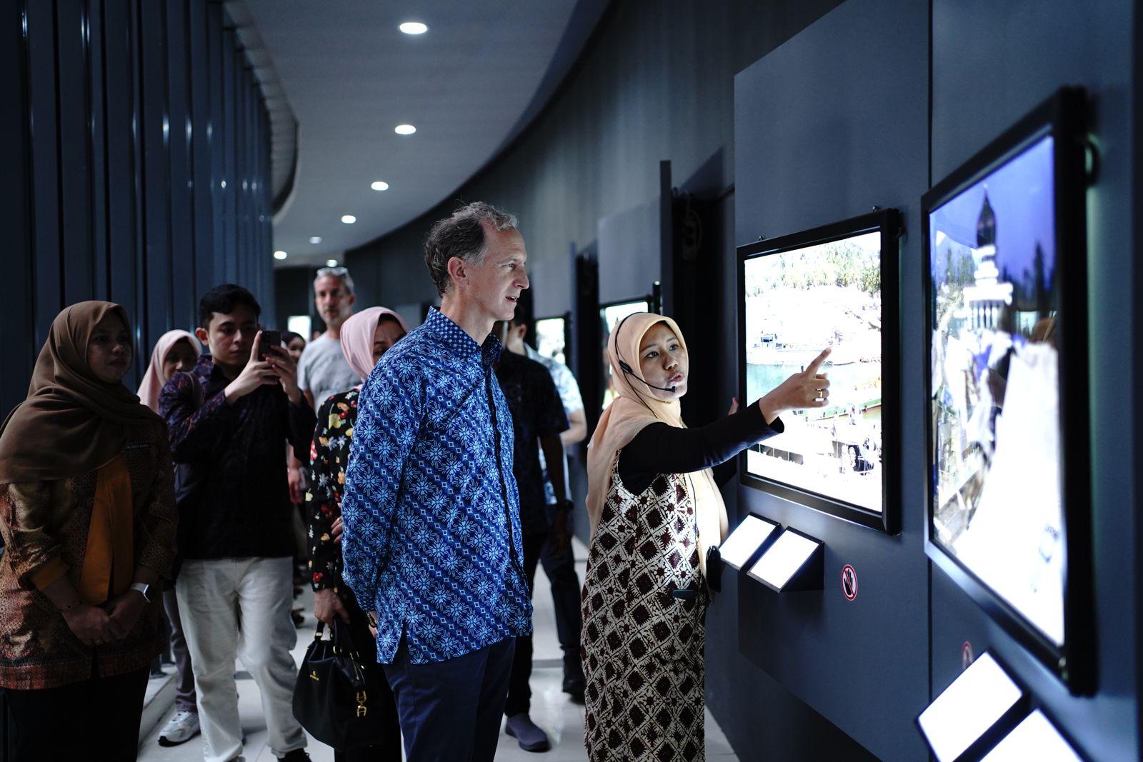 Seorang wisatawan manca negara dan wisatawan lokal lainnya saat mengunjungi museum tsunami di Banda Aceh, beberapa waktu lalu. FOTO/ DOK DISBUDPAR ACEH