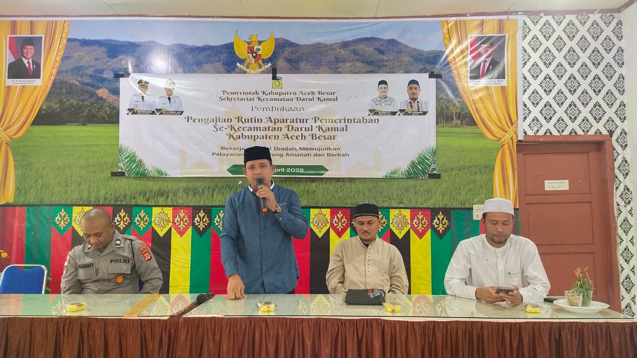 Kabarnanggroe.com, Kota Jantho — Pengajian rutin aparatur pemerintahan se-Kecamatan Darul Kamal, Kabupaten Aceh Besar resmi dibuka di UDKP Kantor Camat Darul Kamal, Kamis (9/4/2026). Kegiatan ini mengusung tema “Bekerja sebagai Ibadah, Mewujudkan Pelayanan Publik yang Amanah dan Berkah.”