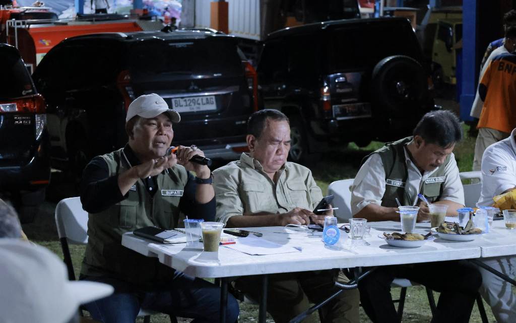 Bupati Aceh Besar Muharram Idris didampingi Deputi BNPB pada Rakor Penanganan Bencana di Posko BPBD Aceh Besar, Sibreh Keumude, Kecamatan Sukamakmur, Kabupaten Aceh Besar, Senin (08/12/2025) malam. FOTO/ ROJA