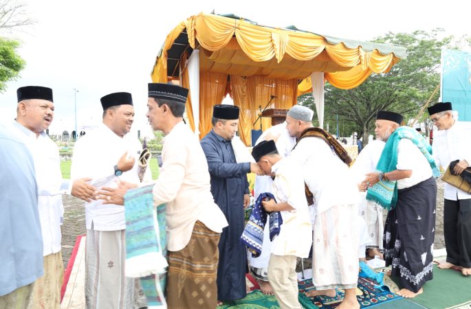 Kabarnanggroe.com, Kota Jantho – Penjabat (Pj) Bupati Aceh Besar Muhammad Iswanto SSTP MM, Forkopimda, Sekda Sulaimi, beserta Jajaran Organisasi Perangkat Daerah (OPD) menunaikan shalat Idul Fitri 1445 H,bersama ribuan warga Kota Jantho dan sekitarnya di lapangan Bungoeng Jeumpa, Kota Jantho, Rabu (10/4/2024) pagi.