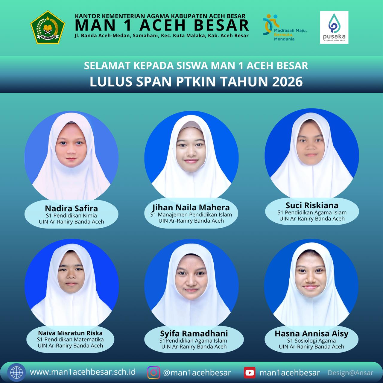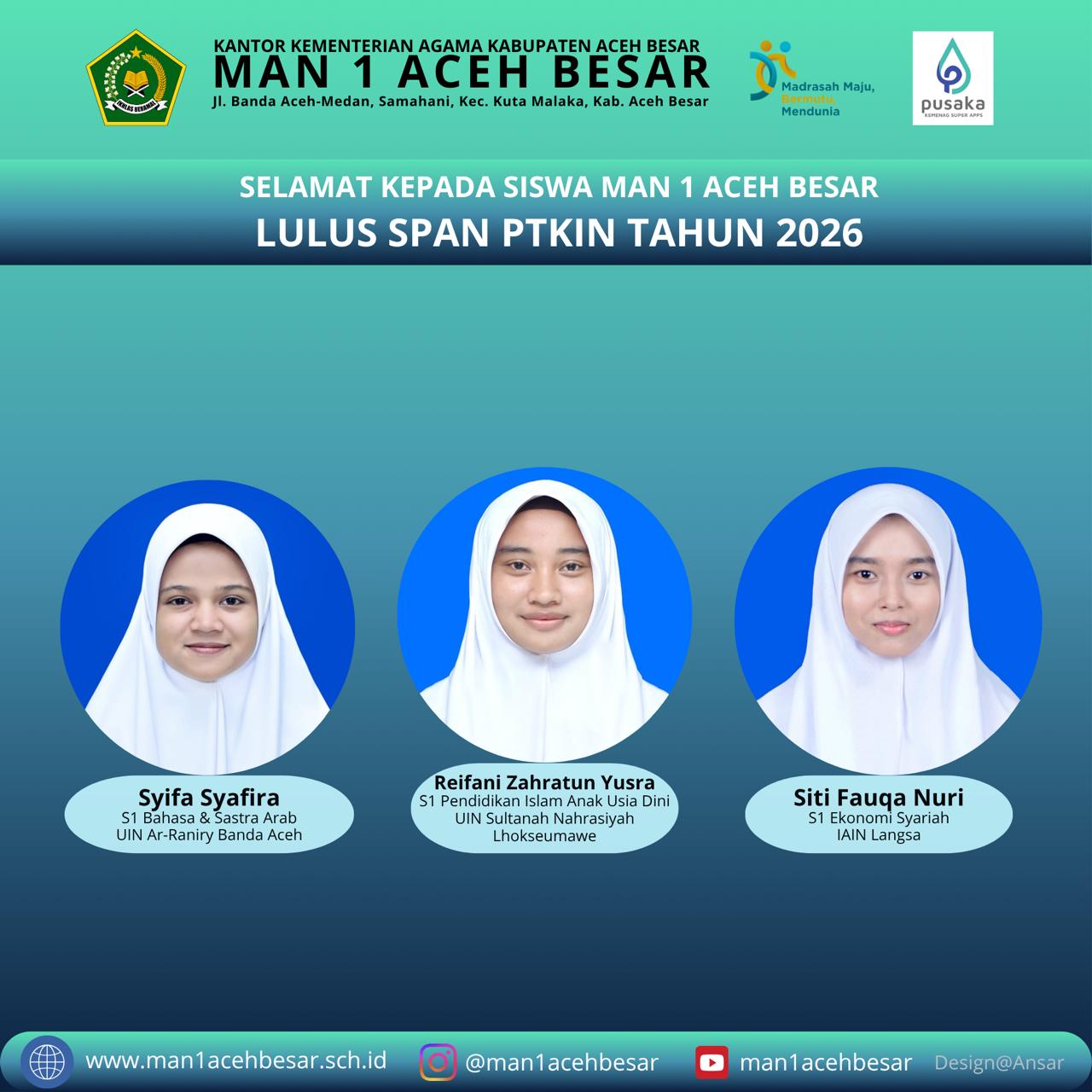 Adapun siswa yang dinyatakan lulus adalah Reza Andika (S1 Pendidikan Matematika UIN Ar-Raniry Banda Aceh), Arif Fadillah (S1 Pendidikan Agama Islam UIN Ar-Raniry Banda Aceh), Alfan Rifki (S1 Hukum Ekonomi Syariah UIN Ar-Raniry Banda Aceh), Rafa Rahmatul Ula (S1 Hukum Ekonomi Syariah UIN Ar-Raniry Banda Aceh), Qurrata A’yuni (S1 Ekonomi Syariah UIN Ar-Raniry Banda Aceh), dan Khansa (S1 Pendidikan Agama Islam UIN Ar-Raniry Banda Aceh). Selain itu, Nadira Safira (S1 Pendidikan Kimia UIN Ar-Raniry Banda Aceh), Jihan Naila Mahera (S1 Manajemen Pendidikan Islam UIN Ar-Raniry Banda Aceh), Suci Riskiana (S1 Pendidikan Agama Islam UIN Ar-Raniry Banda Aceh), Naiva Misratun Riska (S1 Pendidikan Matematika UIN Ar-Raniry Banda Aceh), Syifa Ramadhani (S1 Pendidikan Agama Islam UIN Ar-Raniry Banda Aceh), dan Hasna Annisa Aisy (S1 Sosiologi Agama UIN Ar-Raniry Banda Aceh).