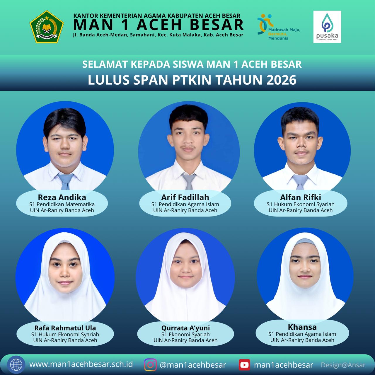 Adapun siswa yang dinyatakan lulus adalah Reza Andika (S1 Pendidikan Matematika UIN Ar-Raniry Banda Aceh), Arif Fadillah (S1 Pendidikan Agama Islam UIN Ar-Raniry Banda Aceh), Alfan Rifki (S1 Hukum Ekonomi Syariah UIN Ar-Raniry Banda Aceh), Rafa Rahmatul Ula (S1 Hukum Ekonomi Syariah UIN Ar-Raniry Banda Aceh), Qurrata A’yuni (S1 Ekonomi Syariah UIN Ar-Raniry Banda Aceh), dan Khansa (S1 Pendidikan Agama Islam UIN Ar-Raniry Banda Aceh). Selain itu, Nadira Safira (S1 Pendidikan Kimia UIN Ar-Raniry Banda Aceh), Jihan Naila Mahera (S1 Manajemen Pendidikan Islam UIN Ar-Raniry Banda Aceh), Suci Riskiana (S1 Pendidikan Agama Islam UIN Ar-Raniry Banda Aceh), Naiva Misratun Riska (S1 Pendidikan Matematika UIN Ar-Raniry Banda Aceh), Syifa Ramadhani (S1 Pendidikan Agama Islam UIN Ar-Raniry Banda Aceh), dan Hasna Annisa Aisy (S1 Sosiologi Agama UIN Ar-Raniry Banda Aceh).