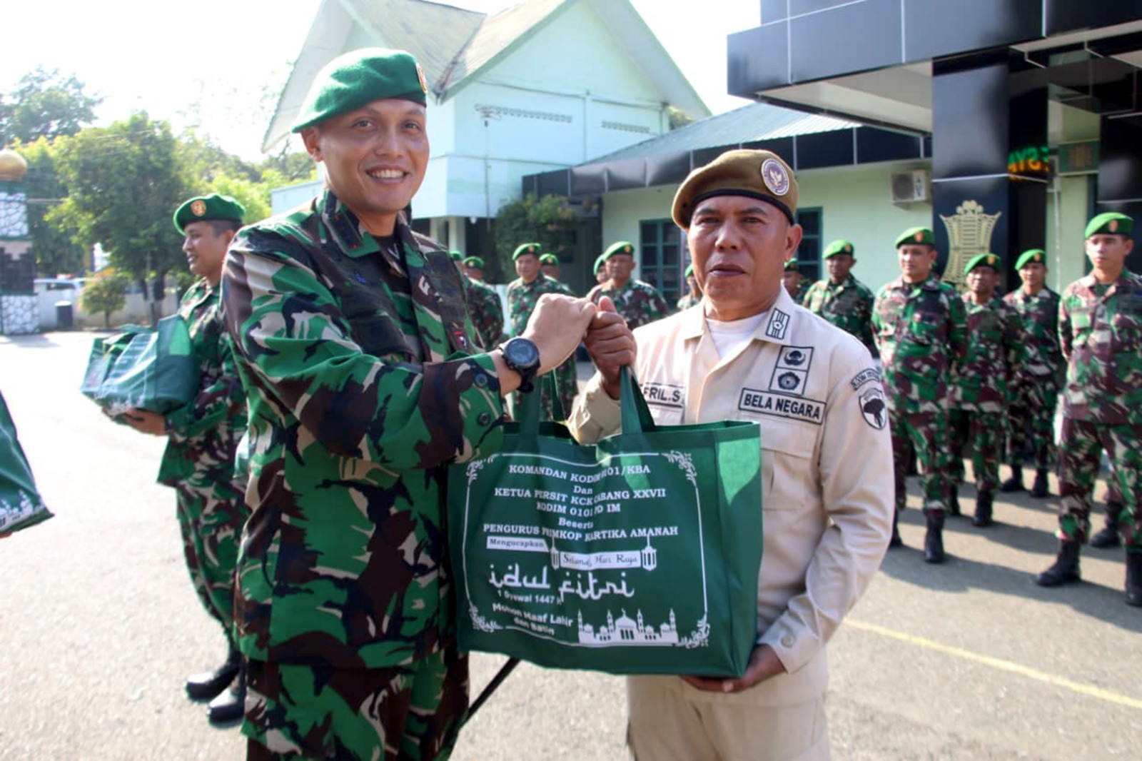 “Jangan dilihat dari besar kecilnya nilai yang diberikan, namun lihatlah ini sebagai simbol rasa kekeluargaan dan kepedulian satuan. Semoga bingkisan ini dapat bermanfaat bagi keluarga di rumah dalam menyambut Idul Fitri 1447 H,” ujar Dandim dengan nada hangat.