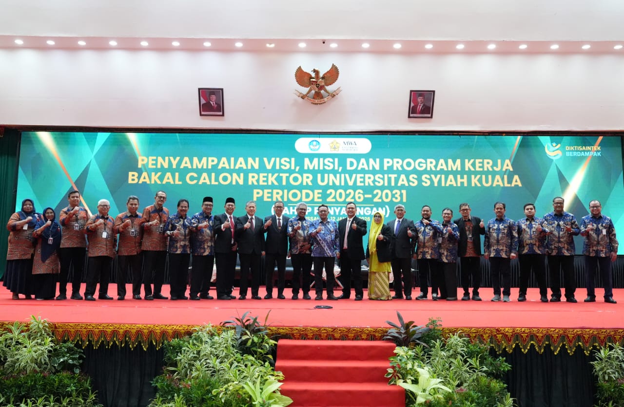 Adapun enam bakal calon Rektor USK yang mengikuti tahapan penyaringan ini adalah Prof. Dr. Ir. Agussabti, M.Si, Prof. Dr. Ir. Marwan, Prof. Dr. Mirza Tabrani, S.E., M.B.A., D.B.A, Dr. Ir. Ramzi Adriman, S.T., M.Sc., IPM., ASEAN.Eng., APEC.Eng, Prof. Dr. Teuku Mohamad Iqbalsyah, S.Si., M.Sc, dan Prof. Dr. Rita Khathir, S.TP., M.Sc.