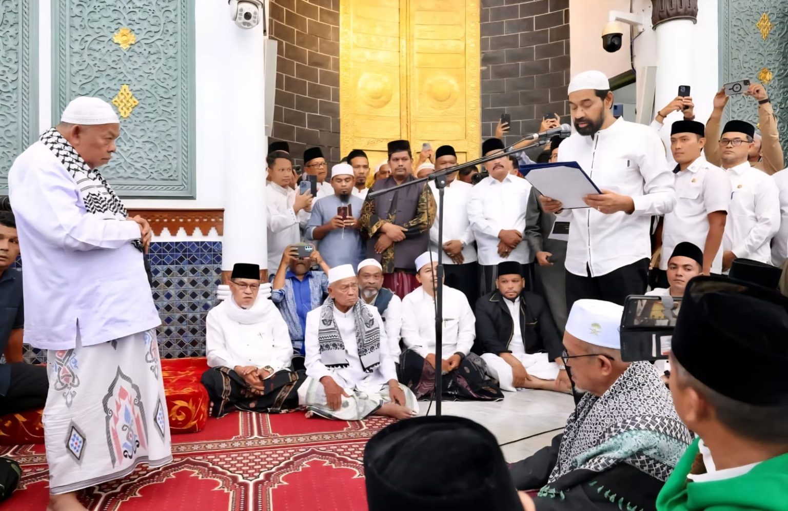 “Dengan mengucap syukur kepada Allah, pada hari ini, Rabu 13 Agustus, saya selaku Gubernur Aceh mengukuhkan Tgk H Muhammad Ali sebagai Imam Besar Masjid Raya Baiturrahman Aceh Tahun 2025,” ujar Mualem saat pengukuhan.