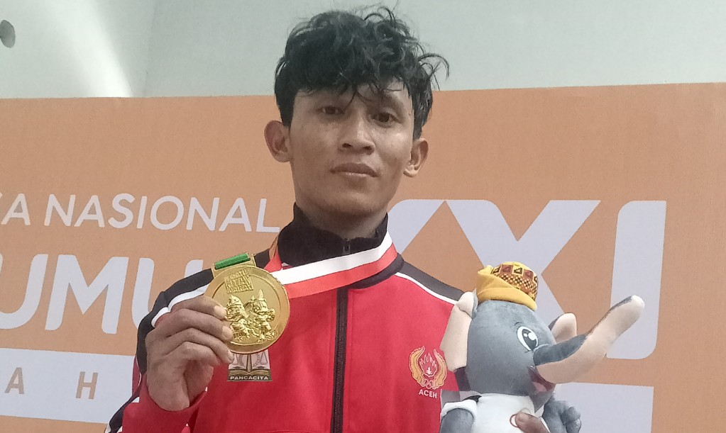 Happy Ending dari Julianto, medali emas pertama yang lahir di GOR Aceh – pasca direnovasi untuk venue PON XXI – bagi Kontingen Aceh. (Adv)