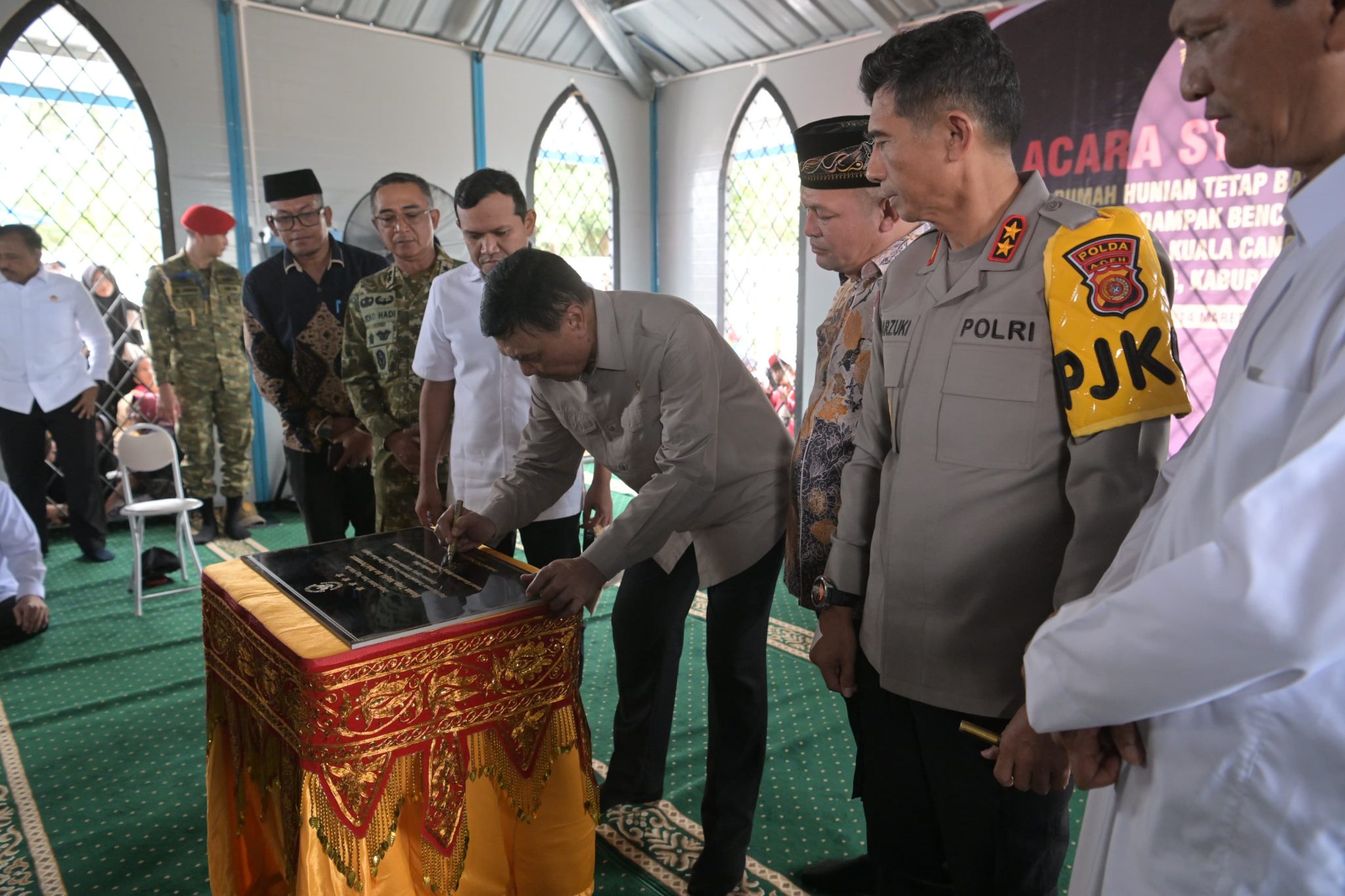 Kabarnanggroe.com, Lhoksukon — Wakil Gubernur Aceh, Fadhlullah, mendampingi Menteri Koordinator Bidang Politik dan Keamanan Republik Indonesia, Djamari Chaniago, meresmikan hunian tetap (Huntap) bagi masyarakat terdampak bencana hidrometeorologi di Desa Kuala Cangkoy, Kecamatan Lapang, Kabupaten Aceh Utara, Sabtu (14/3/2026).