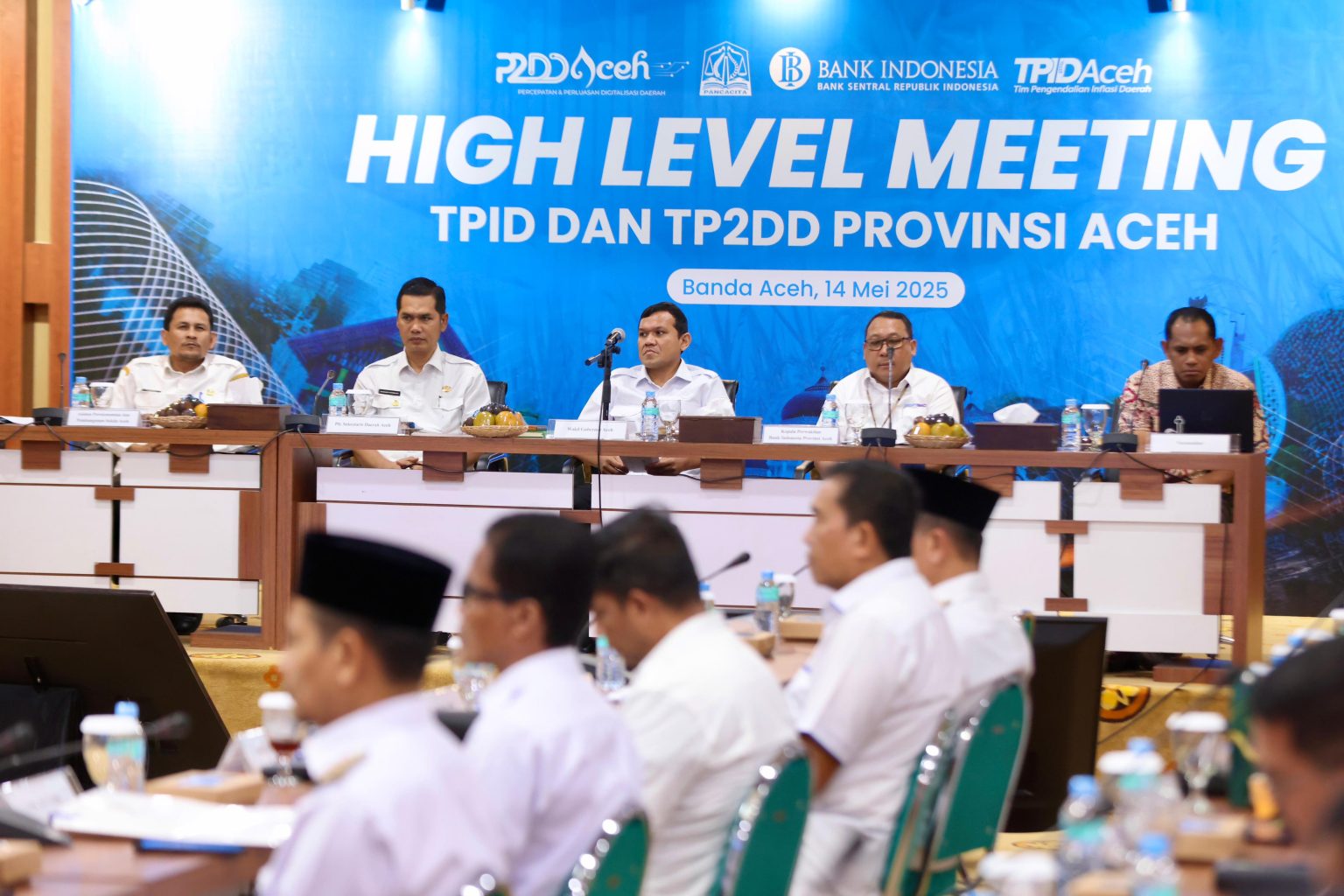 Wakil Gubernur Aceh Fadhlullah, didampingi Plt Sekda Aceh, M. Nasir S.IP, membuka High Level Meeting Tim Pengendalian Inflasi Daerah (TPID) dan Tim Percepatan dan Perluasan Digitalisasi Daerah (TP2DD) Provinsi Aceh, yang dihadiri Bupati/Walikota se Aceh serta pemangku kepentingan lainnya, di Gedung Serbaguna Setda Aceh, Rabu, 14/5/2025