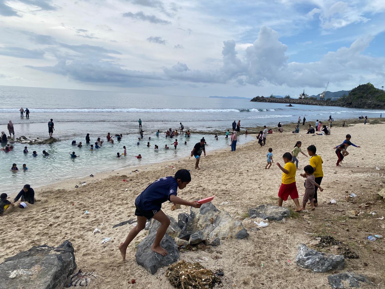 “Kami memilih pantai ini karena bentuknya seperti kolam kecil yang dikelilingi bebatuan. Ombaknya tidak langsung menghantam, jadi lebih aman untuk anak-anak mandi,” ujarnya.