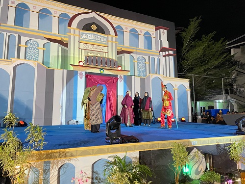 Para santri dan santriwati membawakan drama Malin Kundang pada malam kedua Panggung Gembira, bagian dari rangkaian perayaan Maulid di Ponpes Babun Najah, Ulee Kareng, Banda Aceh, Sabtu (12/10/2024) malam. FOTO/ MUHAMMAD NUR