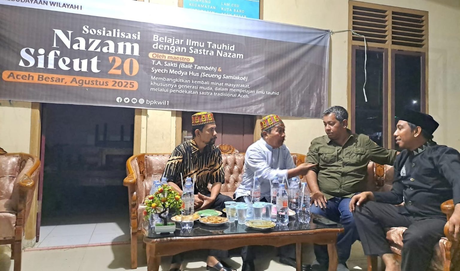 Plt Kadisdikbud Aceh Besar, Dr Agus Jumaidi MPd bersama pemateri Sosialisasi Nazam Sifeut 20 dilaksanakan oleh Balai Pelestarian Kebudayaan (BPK) Wilayah I Provinsi Aceh di Gampong Lamceu, Kecamatan Kuta Baro, Kamis (14/8/2025) malam. FOTO/ RUSYDI