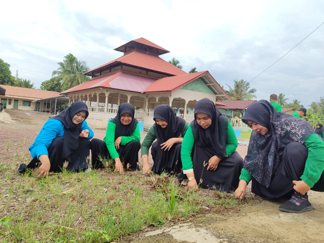 Dewan Guru MIN 6 Aceh Besar sedang membersihkan halaman Masjid At Taqwa Lampupok Kecamatan Indrapuri, dalam kegiatan Gerakan Bersama (GEBER) Bersih-Bersih Masjid (BBM). Senin (16/02/2026). FOTO/HERMAN