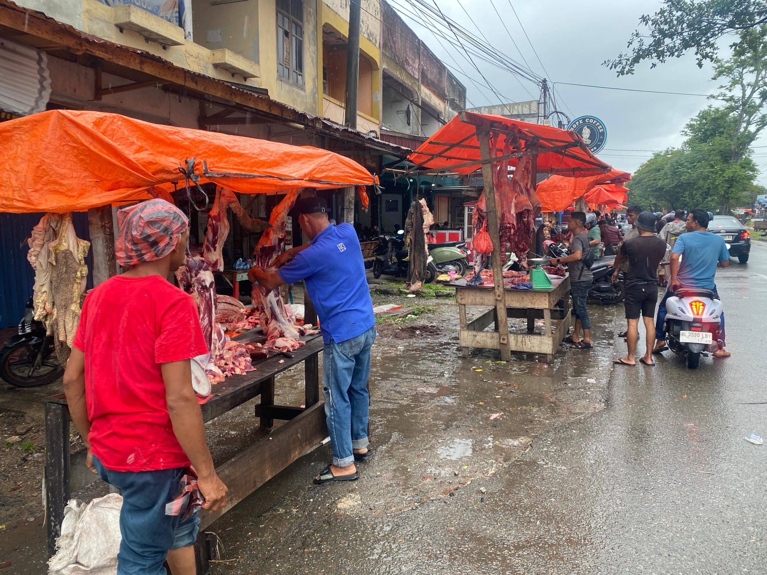 Walaupuan kondisi sedang hujan, aktivitas jual beli daging di kawasan Simpang Keutapang Dua terpantau tetap ramai, meski sebagian pembeli mengaku membandingkan harga dengan pasar murah yang digelar pemerintah.(Zal)