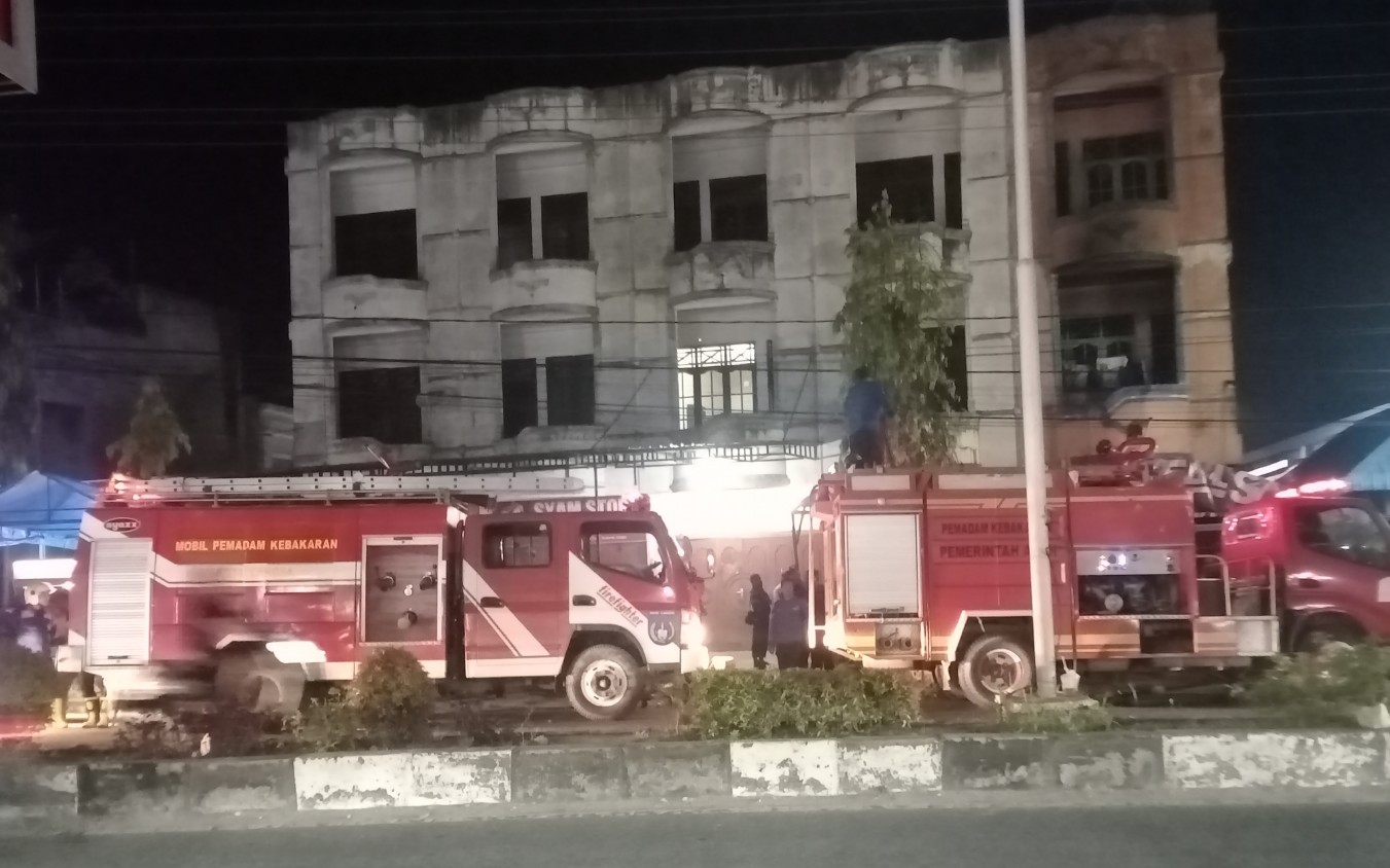 Bangunan ruko berkontraksi beton yang hangus berlokasi persis di sisi ruas jalan A.Yani merupakan Rumah Makan Rezeki Khas Aceh milik Herizal.
