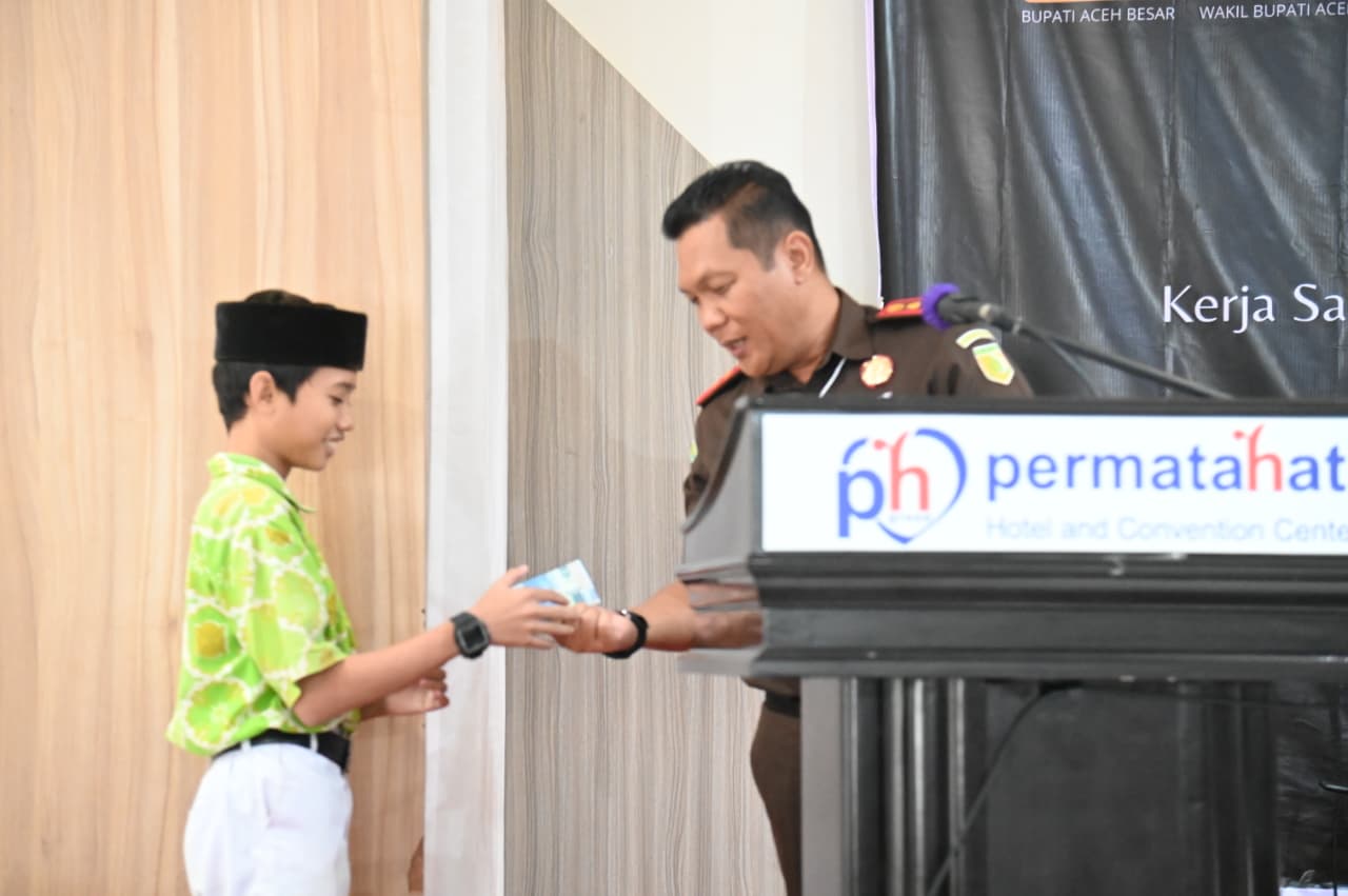 Kajari Aceh Besar, Jimmy Novian Tirayudi, SH, MH, MSi sawer suswa yang berhasil menjawab pertanyaan dalam acara Duta Pelajar Sadar Hukum di Hotel Permata Hati, Gampong Meunasah Manyang PA, Kecamatan Ingin Jaya, Rabu (17/12/2025). FOTO/ BEDU SAINI