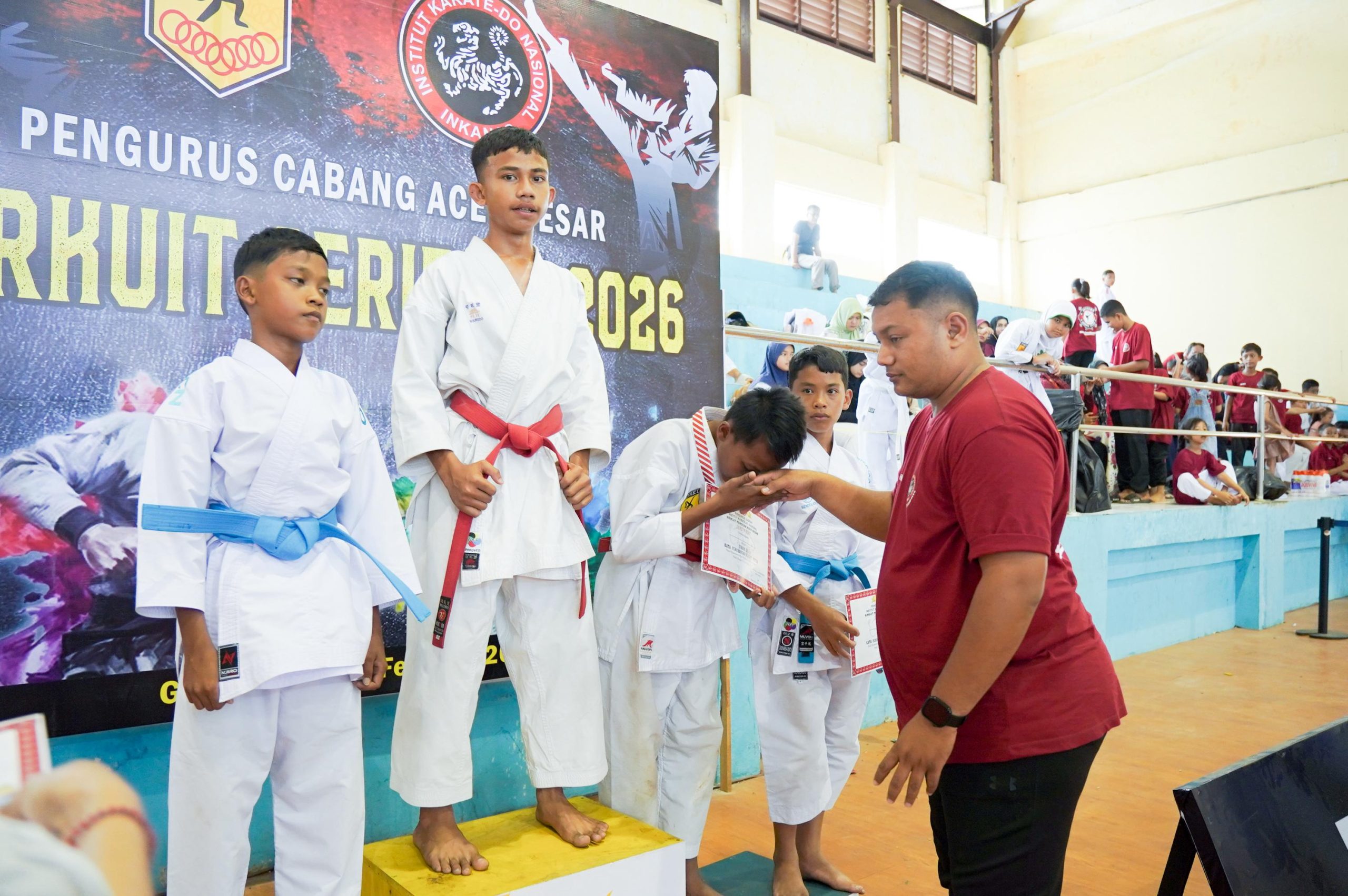 Kabarnanggroe.com, Banda Aceh – Ratusan karateka dari Kota Banda Aceh, Kabupaten Aceh Besar, dan Kabupaten Pidie meramaikan Sirkuit Pengcab Institut Karate-do Nasional (INKANAS) Aceh Besar Series II Tahun 2026 yang digelar di GOR Pango, Kecamatan Ulee Kareng, Kota Banda Aceh, Minggu (15/2/2026).