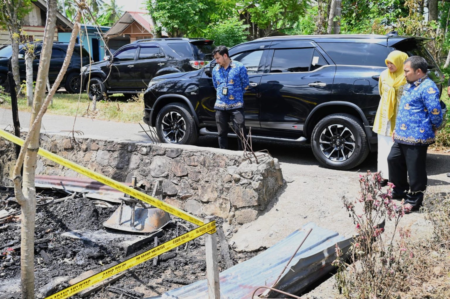 Pj Bupati Aceh Besar, Muhammad Iswanto SSTP MM bersama Plt Kadis Sosial Aceh Besar, Aulia Rahman SSTP MSi dan Camat Blang Bintang, M Kamil Zuhri, S.Stp, MSi meninjau kebakaran rumah warga di Gampong Payah Ue, Kecamatan Blang Bintang, Aceh Besar, Senin (19/02/2024). FOTO/ BEDU SAINI