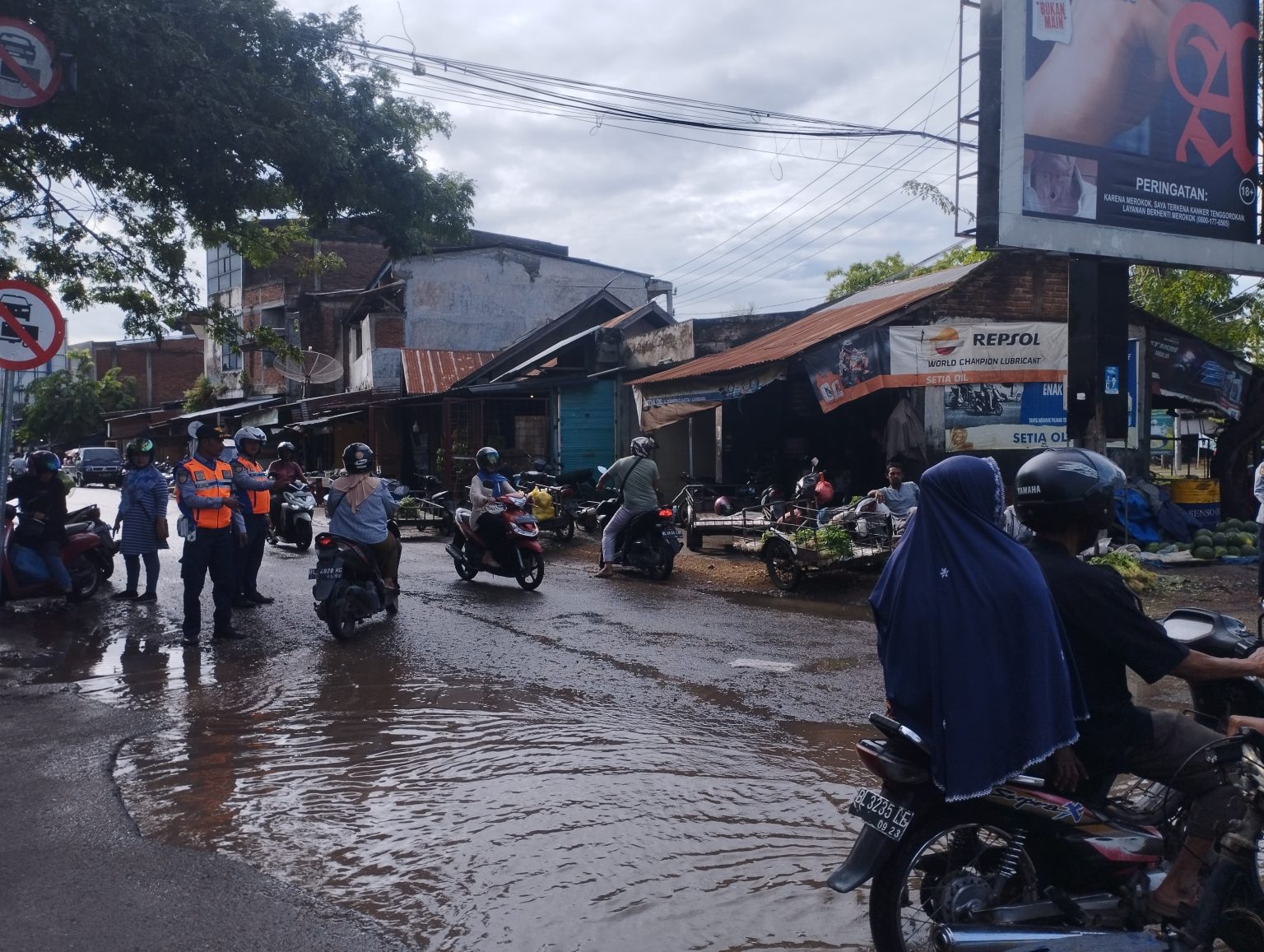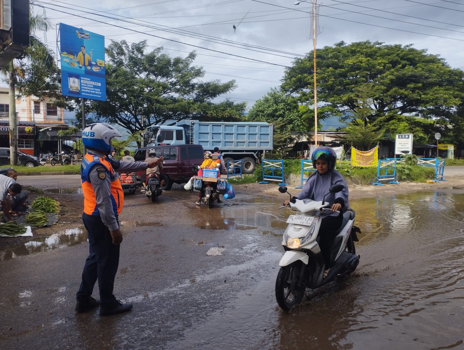 Petugas Dishub Aceh Besar melakukan pengawasan dan pengaturan lalu lintas di Pasar Induk Lambaro, Kabupaten Aceh Besar, Senin (20/5/2024) pagi. FOTO/ WAHYU DESMI