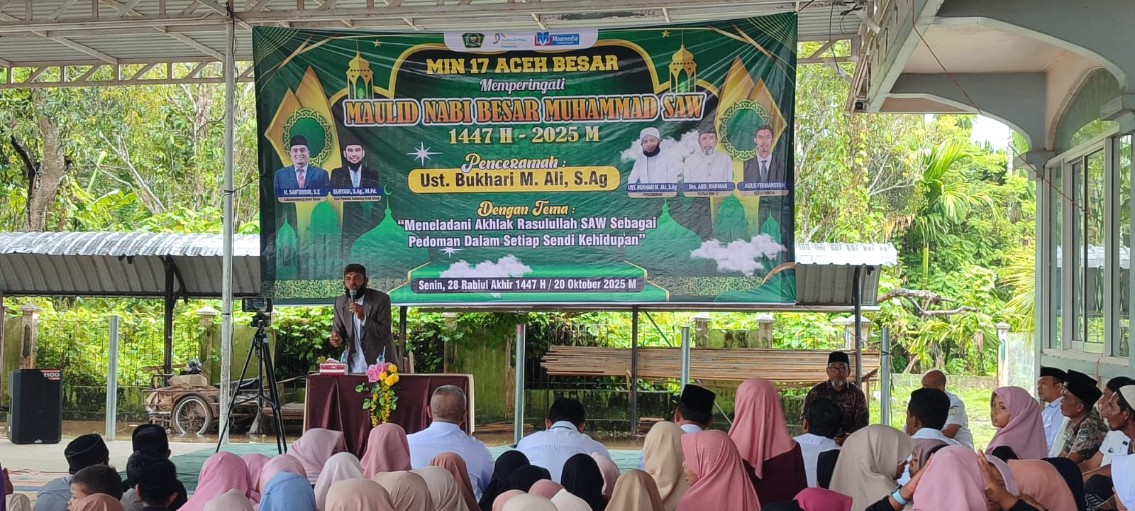 Kepala MIN 17 Aceh Besar Drs. Abd. Rahman, didampingi Ketua Panitia Agus Firmansyah, S.Pd.I., dalam sambutannya menyampaikan bahwa peringatan Maulid Nabi bukan hanya kegiatan seremonial, melainkan momentum untuk memperkuat kecintaan kepada Rasulullah SAW serta menanamkan nilai-nilai keteladanan beliau kepada para siswa.
