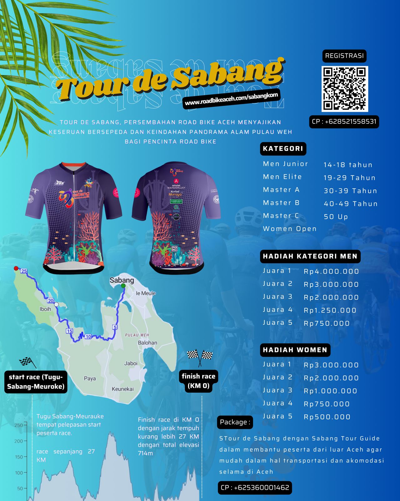 “Dipersembahkan Road Bike Aceh, TDS ini menyajikan keseruan bersepeda dengan keindahan panorama alam Kota Sabang bagi pencinta road bike. Event ini juga menjadi rangkaian yang akan memeriahkan Sabang Marine Festival 2024 (SMF24),” kata Zainal Abidin, Rabu (21/2/2024).