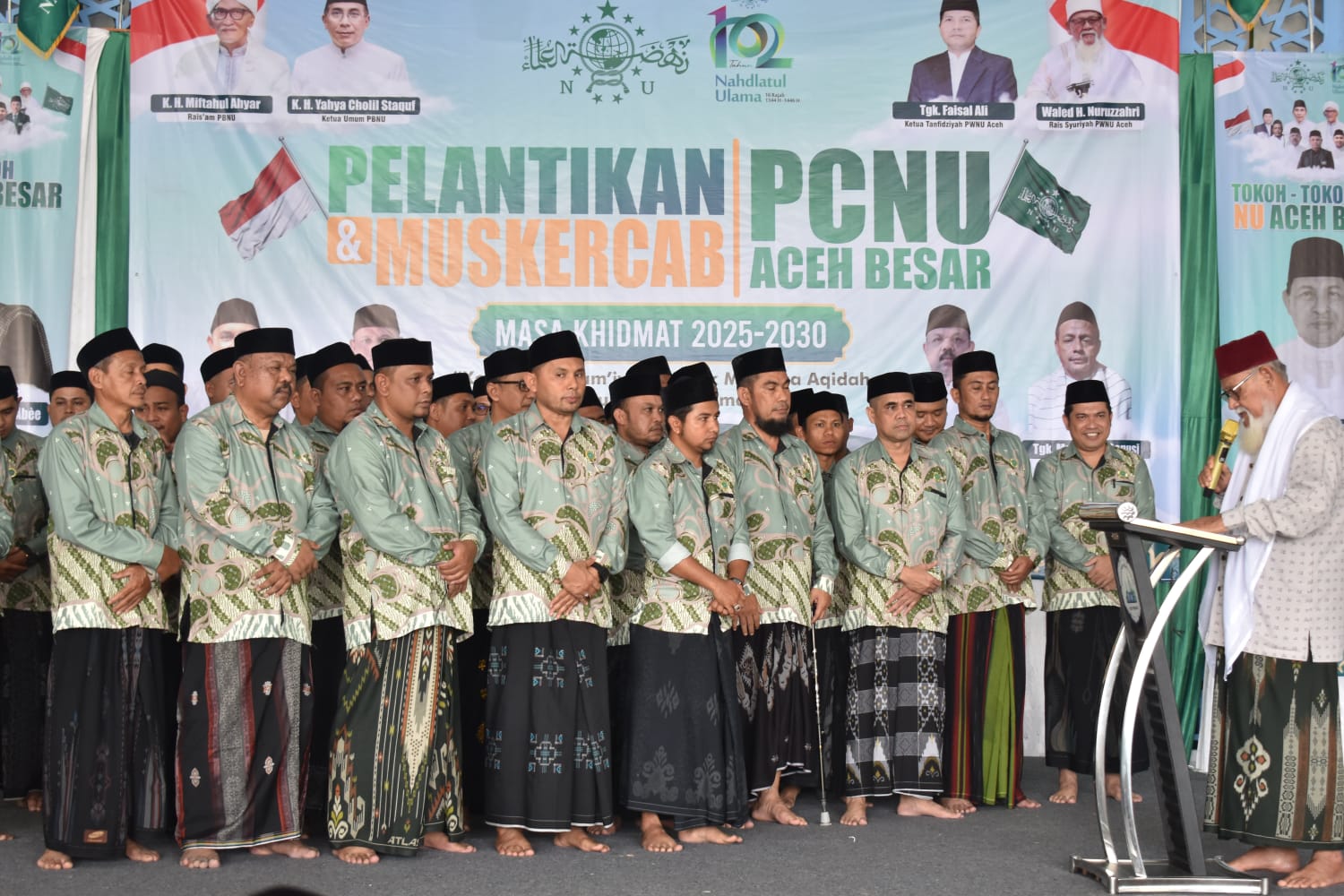 Kabarnanggroe.com, Aceh Besar — Pengurus Cabang Nahdhlatul Ulama kabupaten Aceh Besar masa khidmat 2025-2030 resmi dillantik pada kamis (19/6/2025) di Komplek Pesantren Ruhul Falah Samahani. Pelantikan tersebut dipimpin oleh salah seorang Rais Syuriyah PWNU Aceh Waled H Nuruzzahri Yahya (Waled NU) berlangsung lancar dan bermakna. Sebelum pembacaan naskah bai’at, Ketua Tanfidziyah PWNU Aceh Tgk Faisal Ali membaca semua komposisi kepengurusan PCNU Aceh Besar yang terdiri dari 16 Mustasyar, 9 Syuriah, 12 A’wan, serta 35 jajaran Tanfidziyah.