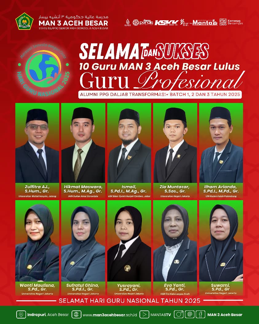 Kabarnanggroe.com, Aceh Besar — Menjelang peringatan Hari Guru Nasional 25 November 2025, Madrasah Aliyah Negeri (MAN) 3 Aceh Besar menerima kabar gembira yang sekaligus menjadi penanda peningkatan mutu pendidikan di institusi tersebut. Sepuluh tenaga pendidik MAN 3 Aceh Besar dinyatakan lulus dan resmi menyandang gelar Guru Profesional (Guru Bersertifikasi Pendidik). Mereka merupakan Alumni Pendidikan Profesi Guru (PPG) Dalam Jabatan (Daljab) Transformasi Batch 1, 2, dan 3 yang berhasil menyelesaikan studinya di berbagai Lembaga Pendidikan Tenaga Kependidikan (LPTK) ternama di Indonesia.