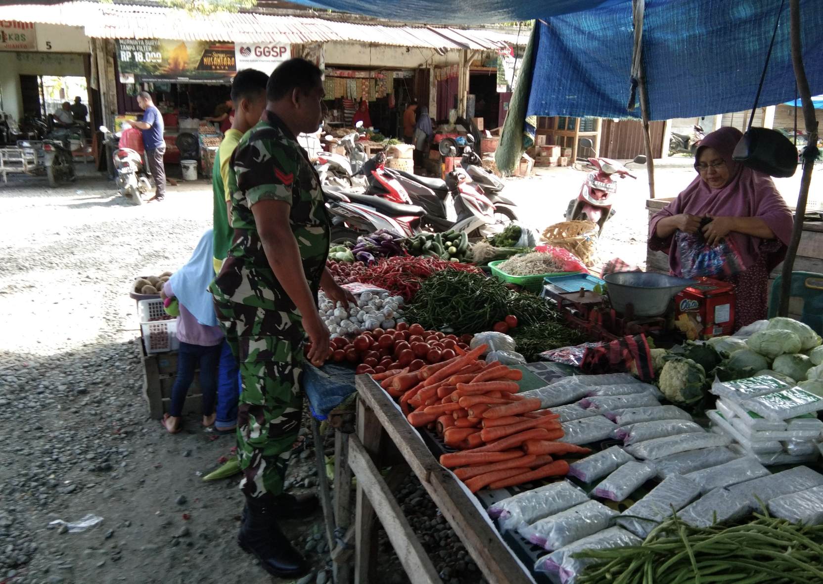 Kabarnanggroe.com, Kota Jantho – Dalam upaya menjaga stabilitas harga kebutuhan pokok di tengah masyarakat, Babinsa Koramil 17/Jantho, Koptu Mulia Saputra, melaksanakan pemantauan harga bahan pokok komoditas terpilih di Pasar Kota Jantho, Kecamatan Kota Jantho, Kabupaten Aceh Besar, Minggu (22/2/2026).