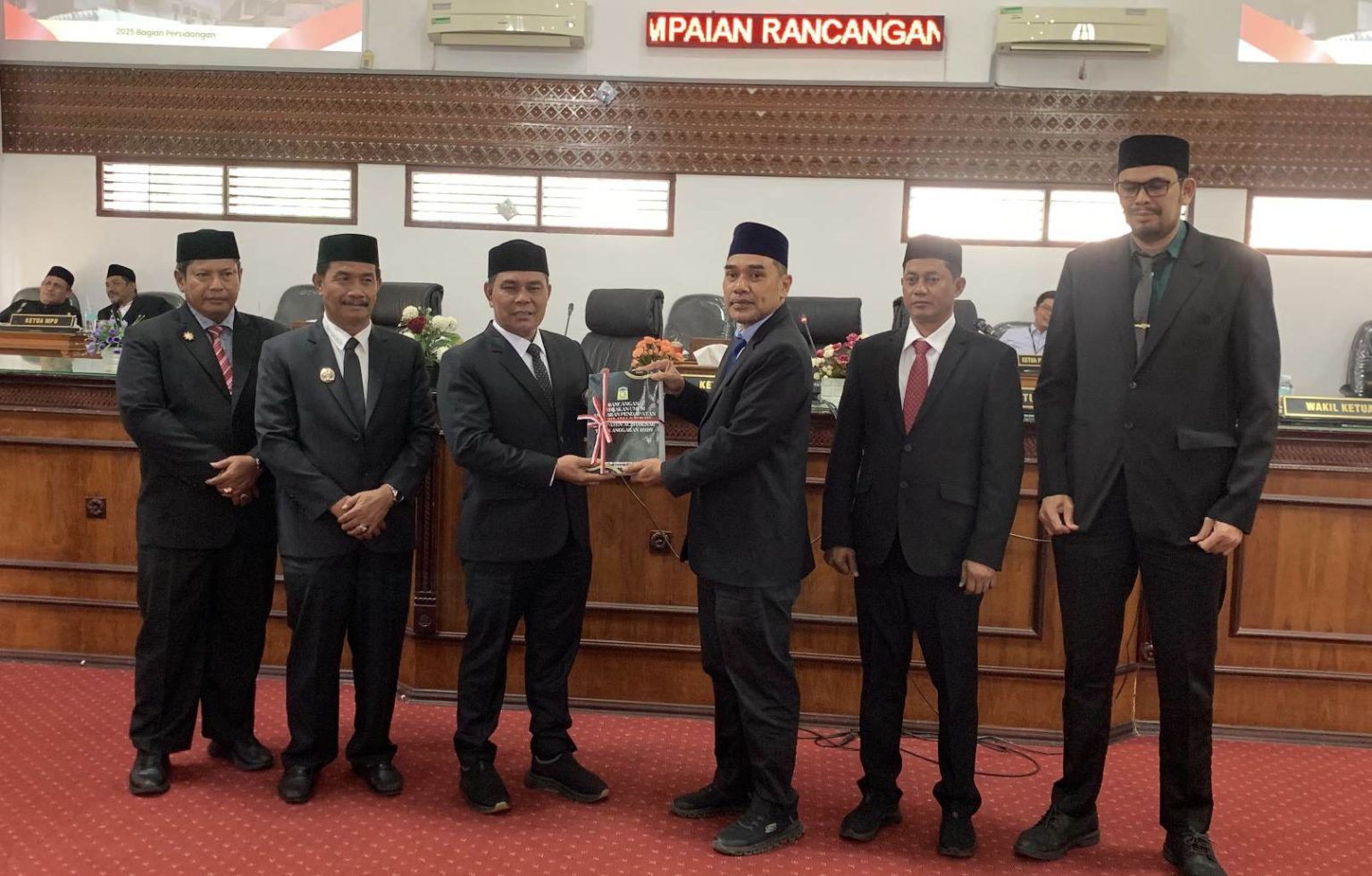 Bupati Aceh Besar H Muharram menyerahkan rancangan KUA dan PPAS APBK Aceh Besar Tahun Anggaran 2026 di Gedung DPRK Aceh Besar, Senin (24/11/2025) siang.FOTO/ ROLLY
