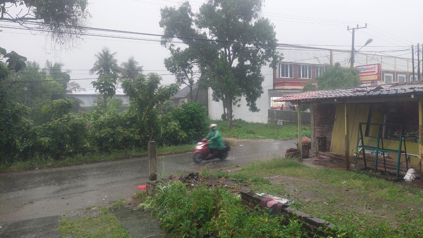 Pengendara sepeda motor berkendara dibawah guyuran hujan deras saat melintasi Jalan Kebon Raja, Ulee Kareng, Banda Aceh, Rabu (24/22/2025) sore. FOTO/MUHAMMAD NUR
