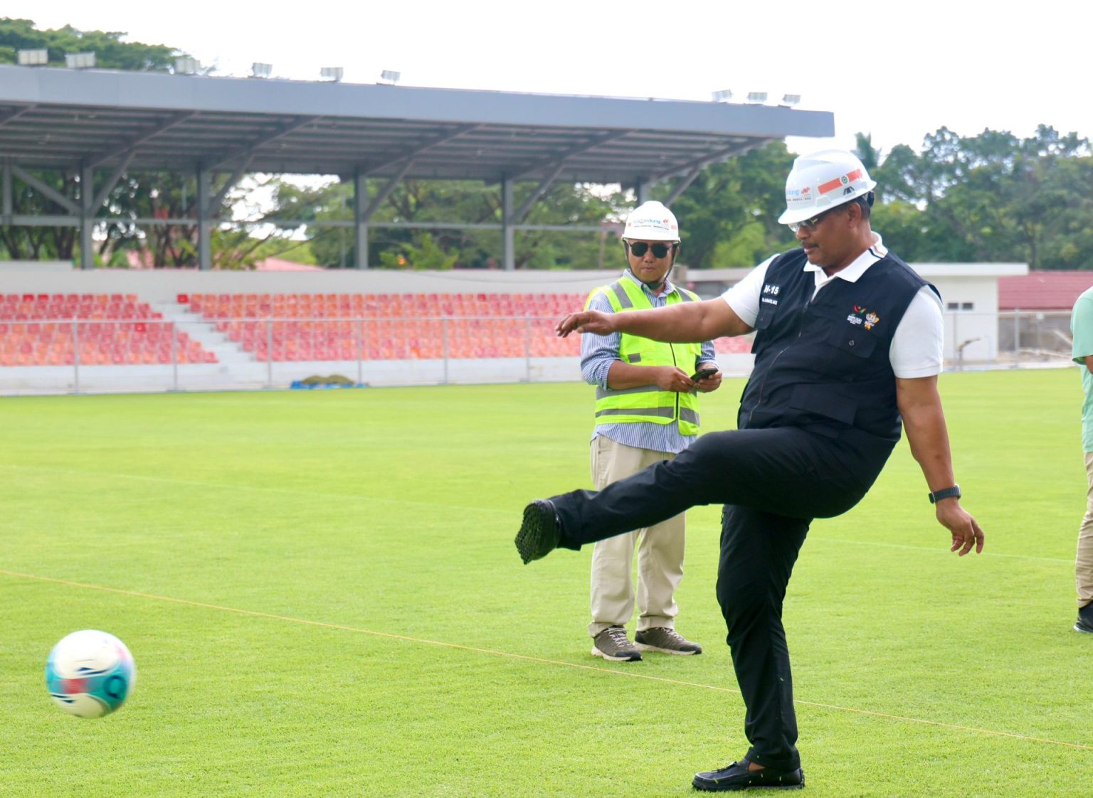 Pj Gubernur Aceh Dr. H. Safrizal ZA, M.Si., mencoba menendang bola untuk menguji rumput stadion H Dimurthala Banda Aceh salah satu venue Cabor Sepakbola untuk perhelatan PON XII Wilayah Aceh, Minggu (25/8/2024). FOTO/ HUMAS PEMERINTAH ACEH