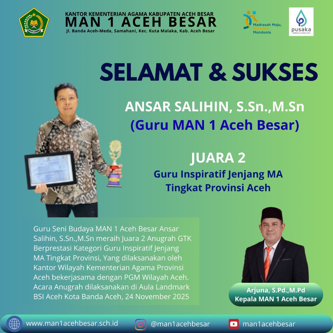 Kabarnanggroe.com, BANDA ACEH – Guru Seni Budaya di Madrasah Aliyah Negeri (MAN) 1 Aceh Besar, Ansar Salihin, S.Sn., M.Sn., berhasil mengukir prestasi gemilang dengan meraih Juara 2 dalam Anugerah Guru dan Tenaga Kependidikan (GTK) Berprestasi Kategori Guru Inspiratif Jenjang MA Tingkat Provinsi Aceh Tahun 2025. Penghargaan bergengsi ini diselenggarakan oleh Kantor Wilayah Kementerian Agama (Kanwil Kemenag) Provinsi Aceh bekerja sama dengan Persatuan Guru Madrasah (PGM) Wilayah Aceh. Acara penganugerahan dilaksanakan di Aula Landmark BSI Aceh, Kota Banda Aceh, pada Senin, 24 November 2025.