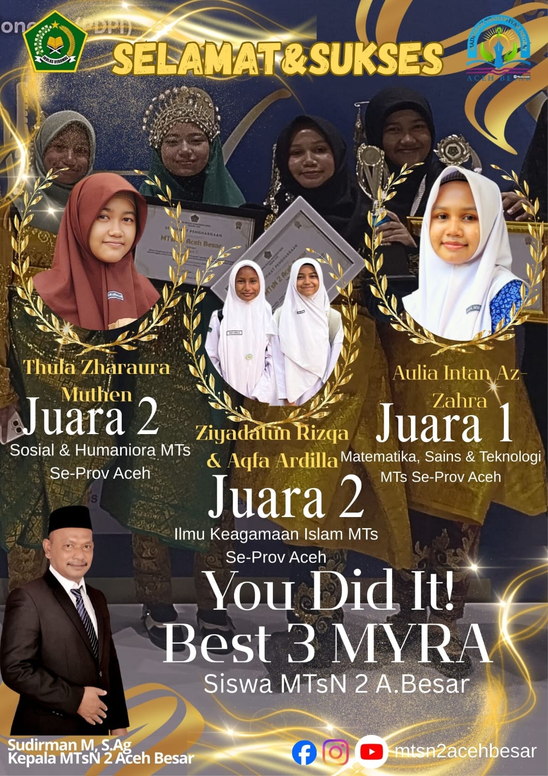 Prestasi dalam Madrasah Young Researchers Aceh (MYRA) ini semakin mengukuhkan posisi MTsN 2 Aceh Besar sebagai madrasah unggulan yang berfokus pada pengembangan riset dan kualitas sumber daya manusia.