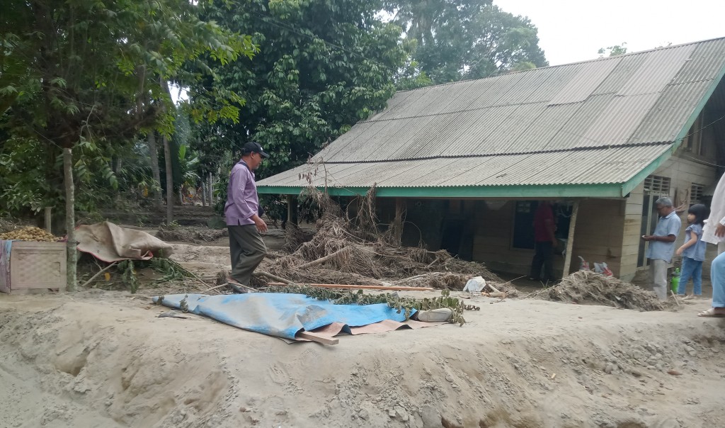 Beberapa hari pasca banjir di kawasan itu berlumpur lalu mulai mengering yang menimbun rumah, persawahan dan pemukiman penduduk.