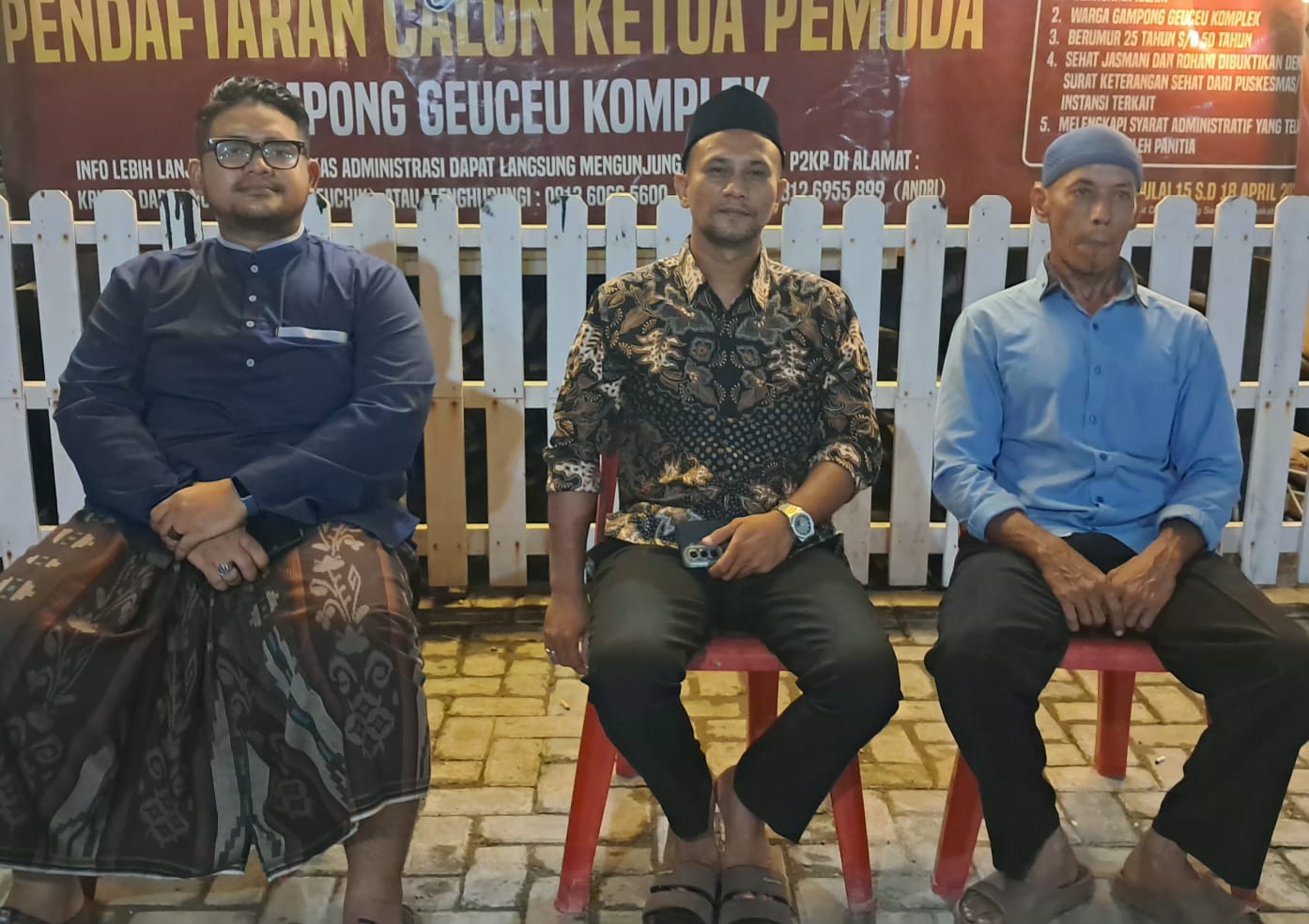 Tiga calon dari kiri ke kanan: Ari Hardiansyah ST (nomor urut 1), Syafrizal (2), dan Syarifuddin (3), pada acara Pemilihan Ketua Pemuda Gampong Geuceu Komplek periode 2026-2029, di Masjid Al-Hasanah Gampong Geuceu Komplek, Banda Aceh, Sabtu (25/04/2026) malam. (Foto: P2KP Geuceu Komplek)