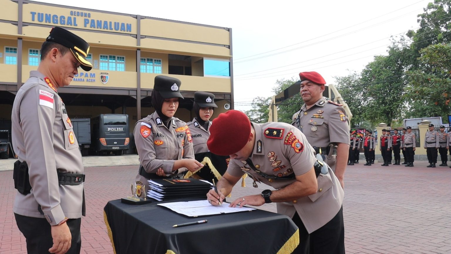 Kapolresta Banda Aceh, Kombes Andi Kirana, menyaksikan Penandatanganan berita acara pelantikan pada upacara serah terima jabatan (sertijab) sejumlah pejabat utama dan kapolsek jajaran di halaman Mapolresta Banda Aceh, Jumat (27/3/2026) pagi. FOTO/ HUMAS POLRESTA BANDA ACEH