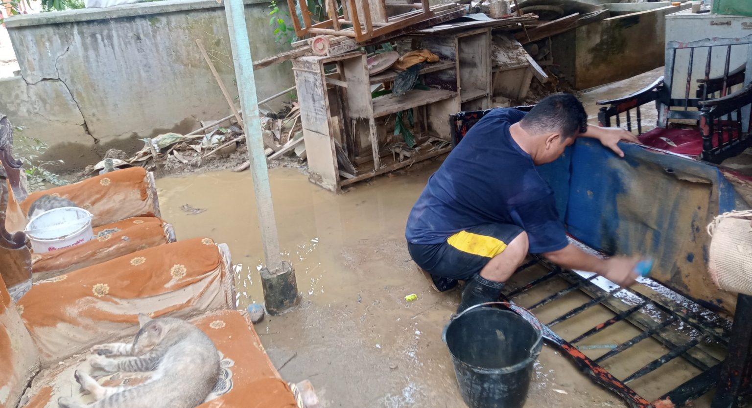 “Dinding, barang-barang, perabotan, dan pakaian banyak yang rusak tidak bisa dipakai lagi karena terendam air bercampur lumpur setinggi satu setengah meter,” ujar Herdiansyah Warga Dusun Kampung Melayu Dua, Gampong (Desa) Daulat