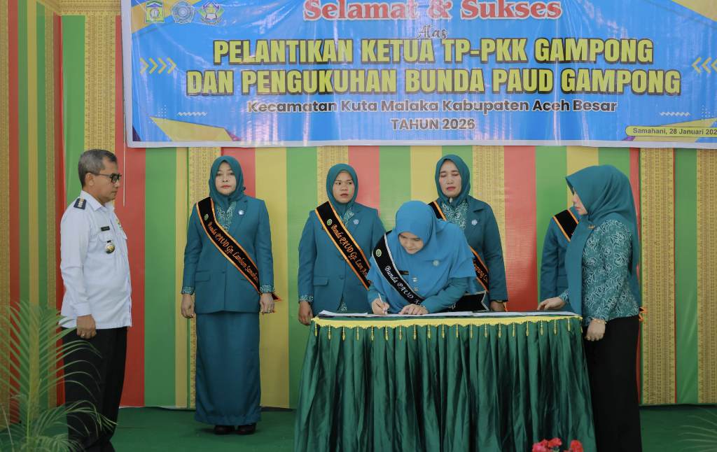 Kabarnanggroe.com, Kota Jantho – Ketua TP PKK Aceh Besar Hj Rita Mayasari menyampaikan amanat dan pesan khusus pada Pelantikan Ketua TP PKK dan Pengukuhan Bunda PAUD Gampong di UDKP Kantor Camat Kuta Malaka, Aceh Besar, Rabu (28/01/2026).