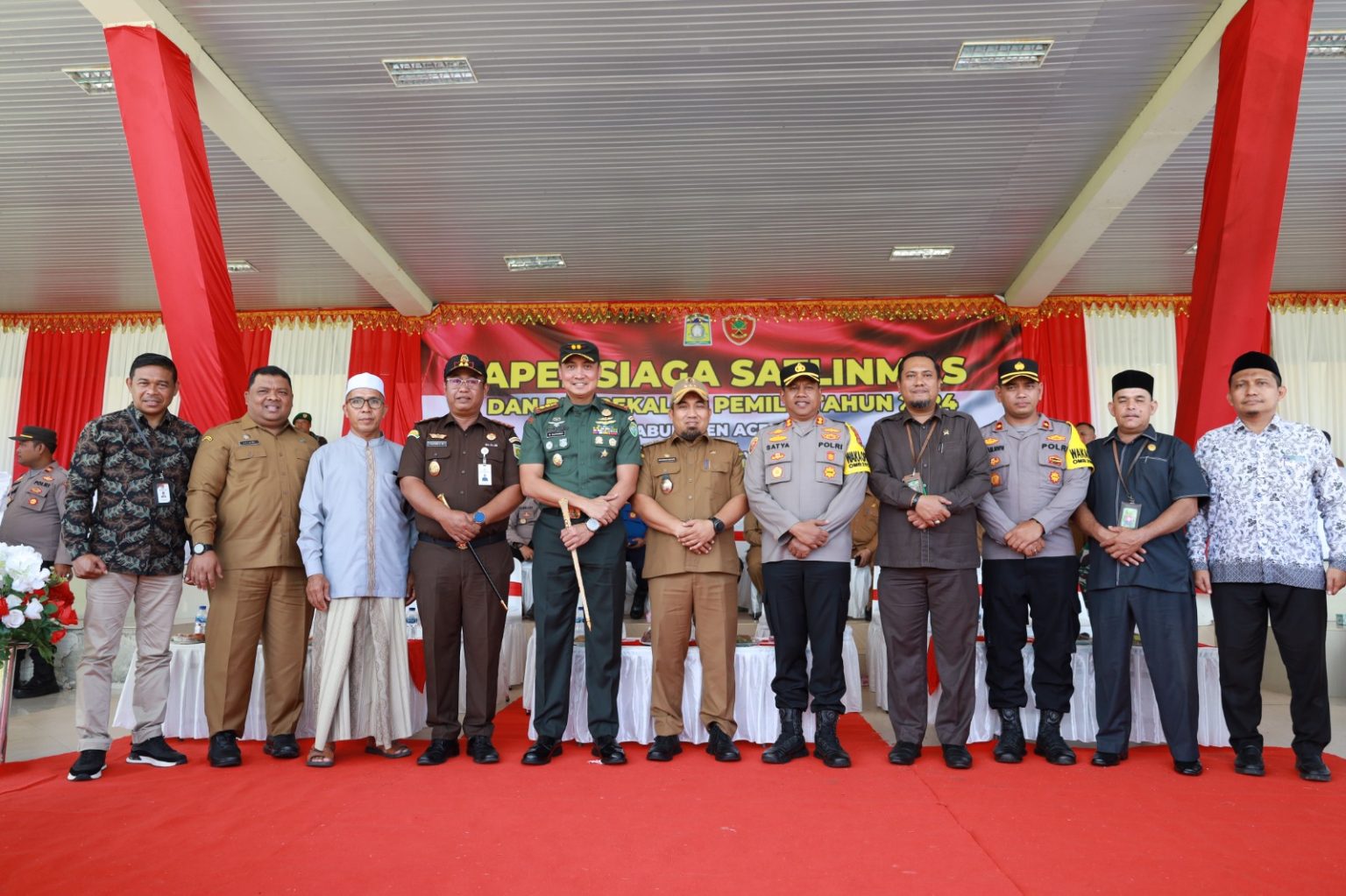 Kabarnanggroe.com, Kota Jantho – Penjabat Bupati Aceh Besar Muhammad Iswanto, S.STP MM bertindak selaku Inspektur Apel Siaga Satlinmas dalam rangka pelaksanaan Pemilu Serentak, dilanjutkan dengan Pembekalan Pemilu tahun 2024 di Lapangan Bungong Jeumpa, Kota Jantho, Selasa (30/1/2024). Hadir dalam kesempatan itu, Dandim 0101/KBA Letkol CZI Widya Wijanarko SSos MTr (Han), Kajari Aceh Besar Basril G SH MH, Ketua Pengadilan Negeri Jantho Deny Syahputra SH MH, Wakapolresta Banda Aceh AKBP Satya Yudha Prakasa SIK MH, Wakapolres Aceh Besar Kompol Rustam Nawawi, Ketua MPU Aceh Besar Tgk H Nasruddin, Sekdakab Aceh Besar Drs Sulaimi MSi, komisioner KIP Aceh Besar, Panwaslu Aceh Besar, para camat, Kapolsek, Danramil, dan pejabat OPD terkait.