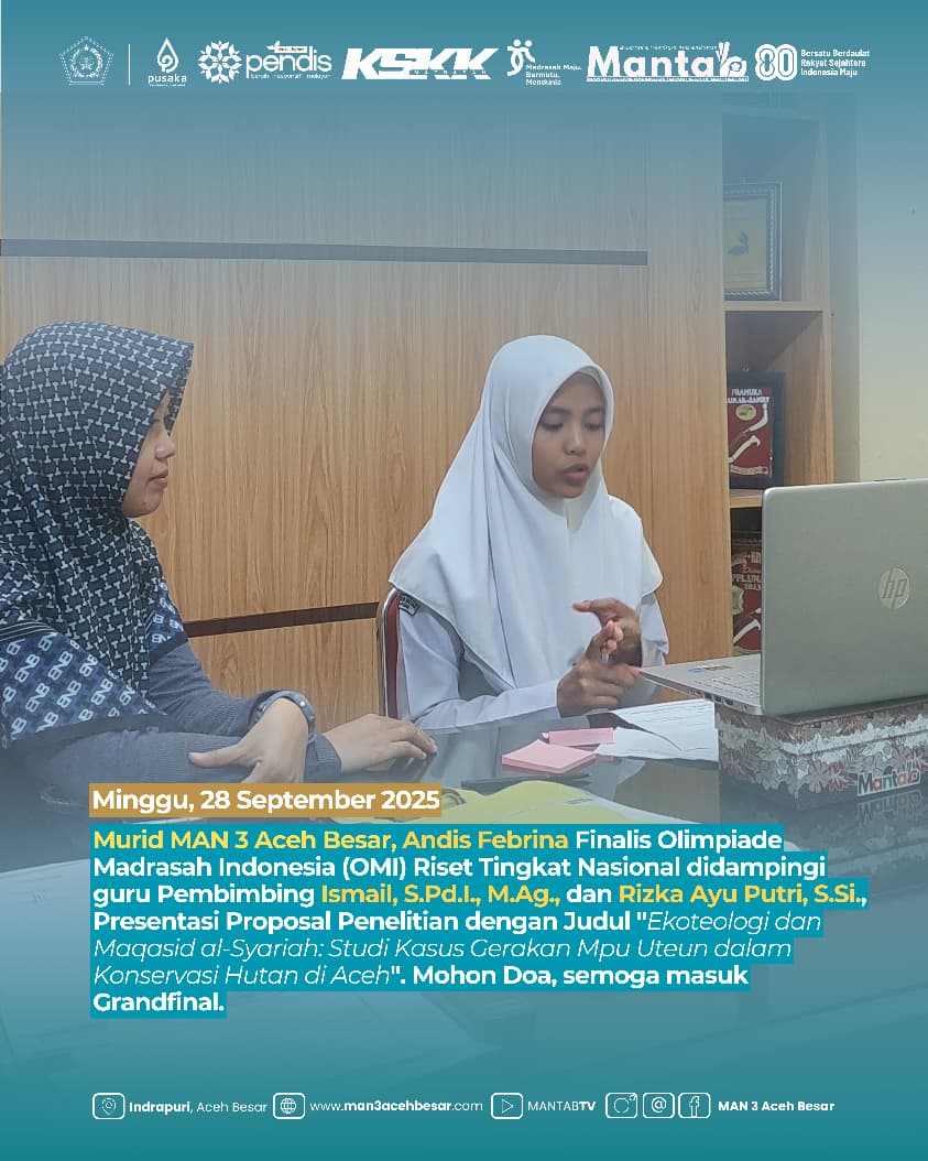 Kabarnanggroe.com, ACEH BESAR— Andis Febrina, siswi Madrasah Aliyah Negeri (MAN) 3 Aceh Besar, tengah meniti panggung riset tingkat nasional dengan membawa isu yang amat lokal, namun bergaung global: ekologi dan Maqasid al-Syari’ah dalam konservasi hutan. Pada Minggu, 28 September 2025, Andis didampingi guru pembimbingnya mempresentasikan proposal penelitian yang diberi judul mendalam, “Eko-teologi dan Maqasid al-Syari’ah: Studi Kasus Gerakan Mpu Uteun dalam Konservasi Hutan di Aceh.”