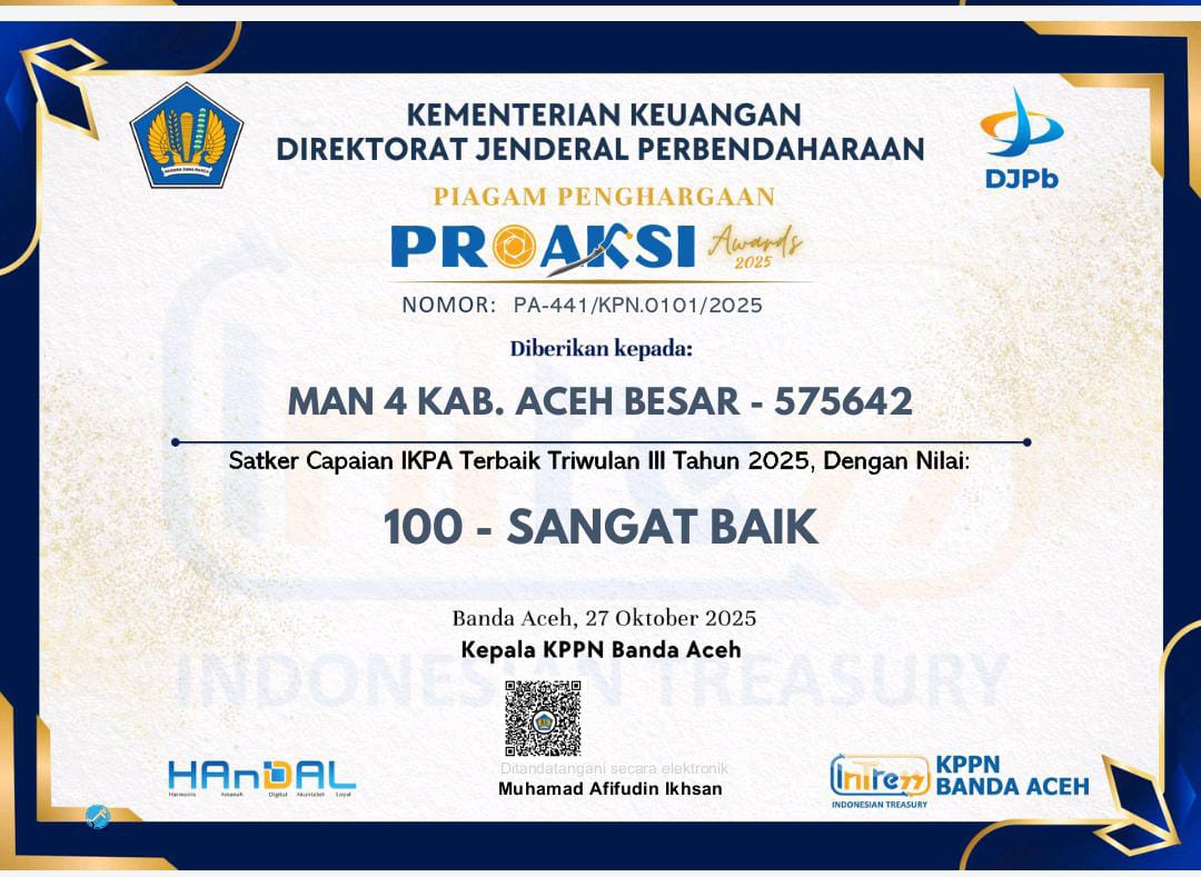 Kabarnanggroe.com, Aceh Besar – Madrasah Aliyah Negeri (MAN) 4 Aceh Besar kembali memporeh prestasi membanggakan, Dalam ajang PROAKSI Awards Triwulan III Tahun 2025 yang diselenggarakan oleh Kementerian Keuangan RI melalui Direktorat Jenderal Perbendaharaan, MAN 4 Aceh Besar berhasil meraih piagam penghargaan atas pencapaian Indikator Kinerja Pelaksanaan Anggaran (IKPA) terbaik dengan nilai sempurna 100 dan predikat “Sangat Baik.”